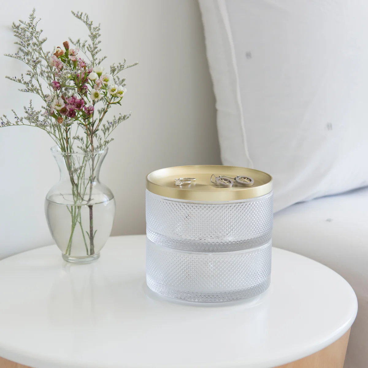 Die Schmuckbox besteht aus zwei Schalen, die sich übereinander stapeln lassen. Während das Gefäß aus marmoriertem weißen Harz oder aus Glas gefertigt ist, ist der Deckel wahlweise mit einer Messing- oder Nickel-Beschichtung versehen. Die liebsten Schmuckstücke sind hier sicher sowie platzsparend verstaut und zudem sorgen die kontrastierenden Materialien für einen dekorativen Hingucker.
