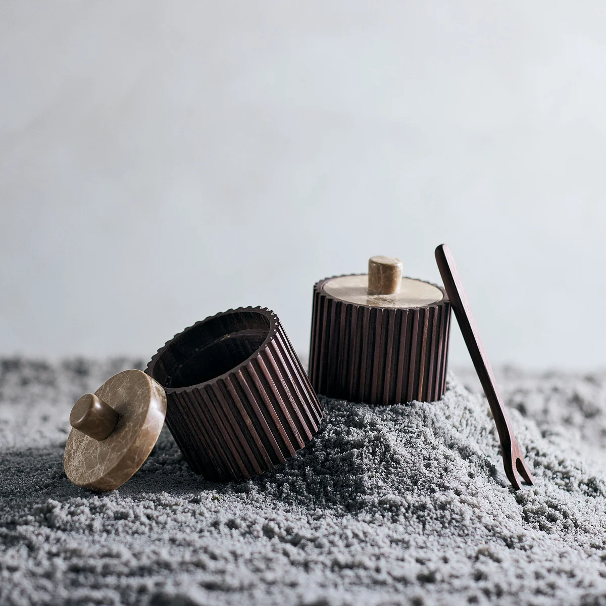 Die stilvolle Vorratsdose mit Deckel aus der Yami-Serie besticht durch ihre besondere Materialkombination aus karbonisiertem Eschenholz und hellem Marmor. Das dunkle Holz verleiht der Dose ihren charakteristischen Ausdruck, während der Deckel aus hellerem Marmor mit abgerundeten Kanten für einen harmonischen Kontrast sorgt – zugleich ästhetisch und alltagstauglich. Inspiriert von der japanischen Designtradition, ist die Dose nicht nur ein praktisches Aufbewahrungselement für Salz, Gewürze oder kleine Küchenutensilien, sondern auch ein dekoratives Highlight auf dem gedeckten Tisch – ideal in Kombination mit hellen Steinzeug-Elementen.