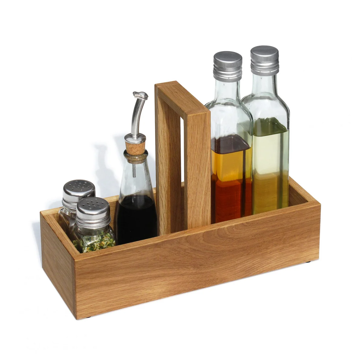 Die Tischbox Essig & Öl von side by side ist der perfekte Helfer für deinen Esstisch – funktional, formschön und vielseitig einsetzbar. Ob für Essig, Öl, Salz und Pfeffer oder als stilvolle Aufbewahrung für Nähzeug, Stifte und Kleinigkeiten: Die minimalistische Holzbox bringt Ordnung und Design auf den Punkt.