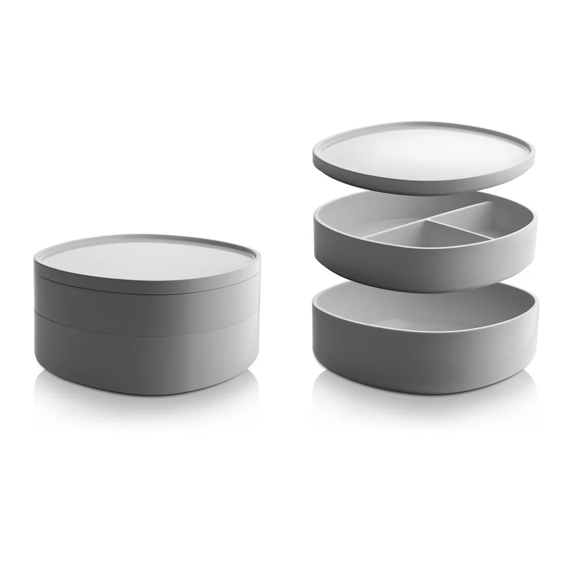 Der Bad-Behälter von Designer Piero Lissoni verleiht dem schlichten Alltagsgegenstand eine ungeahnte Eleganz. In der dreiteiligen Birillo-Box finden viele kleine Gegenstände Platz - von Zopfgummis und Haarspangen über Wipernzange bis hin zum Schminkzeug. Der untere Behälter fasst größere Utensilien, während der obere in drei Teile gegliedert ist. So ist für fast jedes Utensil im Badezimmer der richtige Platz vorhanden.