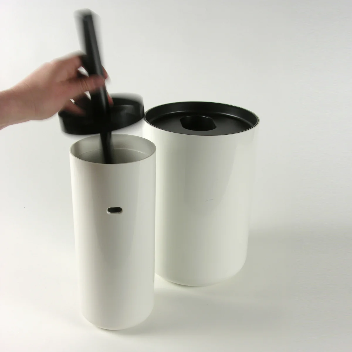 Die Lunar WC-Bürste von Authentics ist Teil der gleichnamigen Badezimmer-Kollektion der Designer Edward Barber und Jay Osgerby. Wie einen Säbel zieht man die Bürste aus der Hülle. Der integrierte Deckel schützt die Hände während des Putzens vor Spritzwasser. Der Bürstenkopf kann abgeschraubt und ersetzt werden. Durch ein längliches Loch im Bürstenhalter kann die Lunar WC-Bürste besser trocknen.