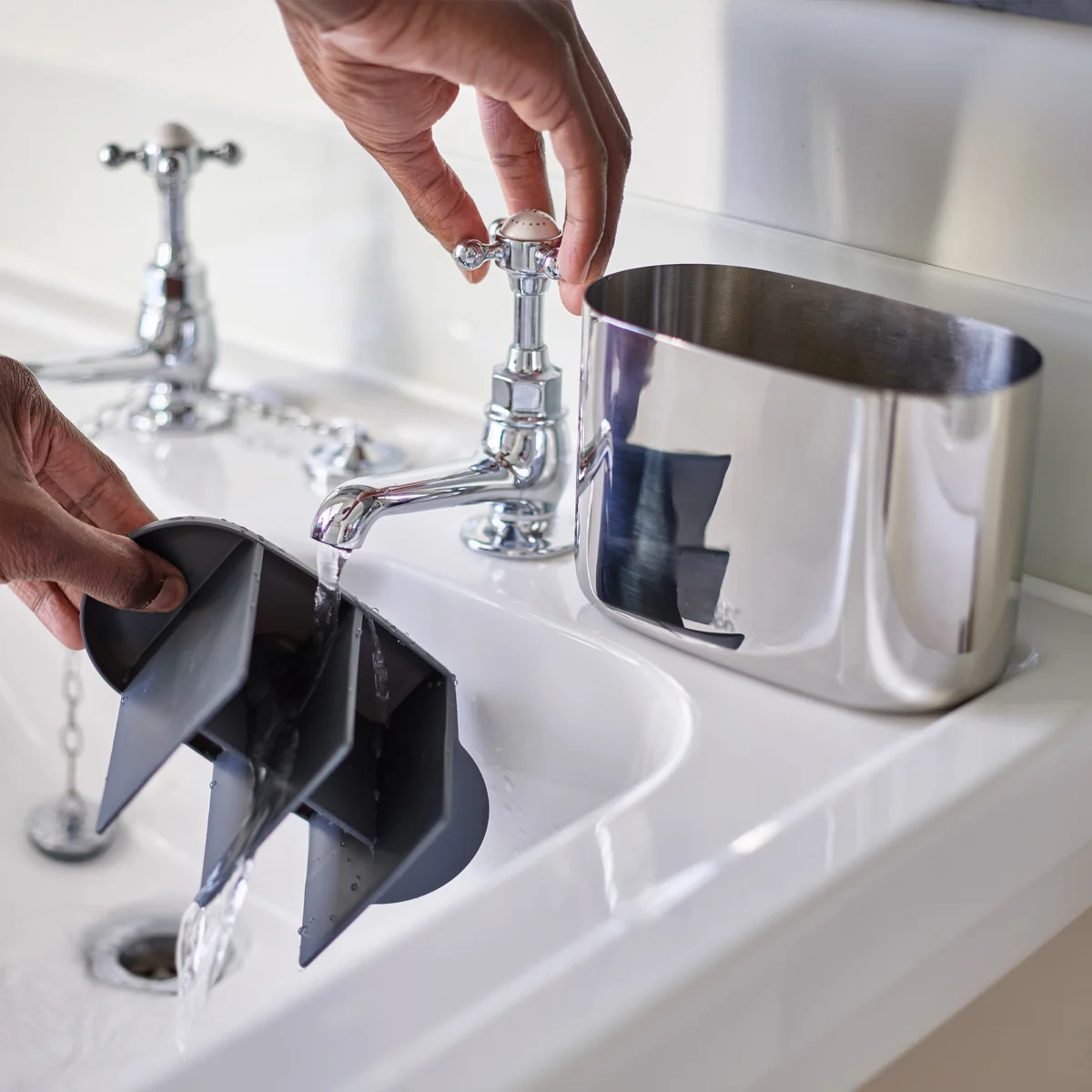 Der EasyStore Luxe Zahnbürstenhalter des Herstellers Joseph Joseph begeistert mit seinem edlen Design. Der Zahnbürstenhalter wird aus poliertem Edelstahl gefertigt. Er eignet sich hervorragend für Zahnbürsten, Zahnpastatuben und Zungenreiniger. Je nach Präferenz ist der Zahnbürstenhalter in unterschiedlichen Größen erhältlich. Die Trennwände des Halters bieten maximale Ordnung. Er lässt sich bei der Reinigung simpel zerlegen.