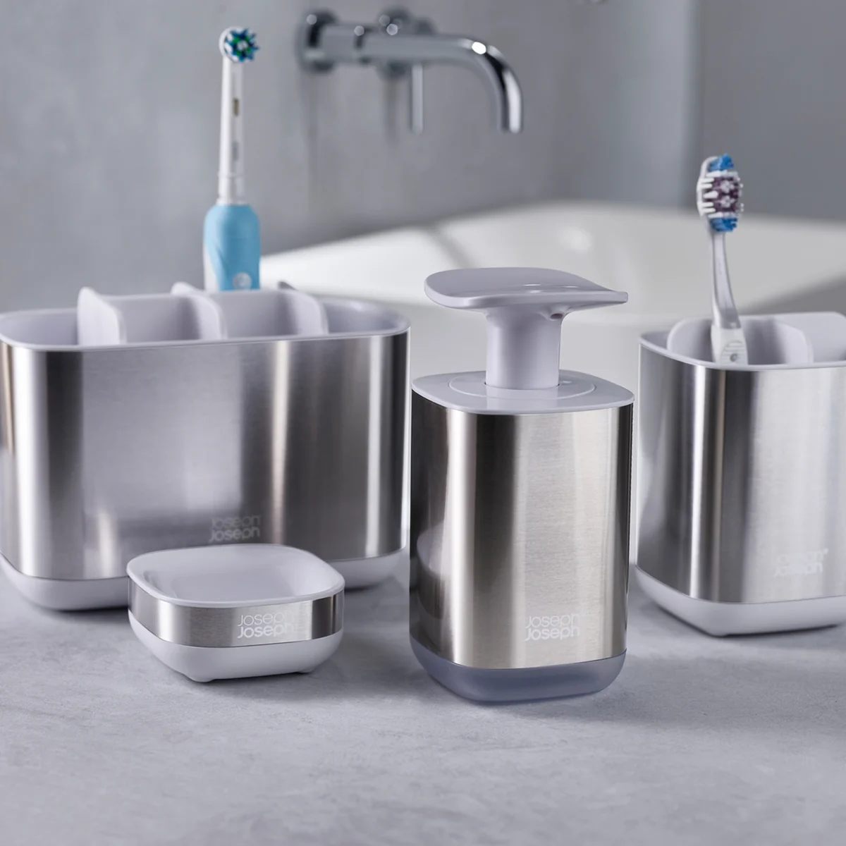 Der EasyStore Steel Zahnbürstenhalter von Joseph Joseph ist eine tolle Ergänzung für das Badezimmer und bietet Platz für Zahnpflegeprodukte wie Zahnbürste, Zahnpasta oder Zahnseide. Dank verschiedener Fächer kann der Behälter einfach unter Familienmitgliedern oder WG-Bewohnern aufgeteilt werden, sodass jeder seinen eigenen Bereich erhält.