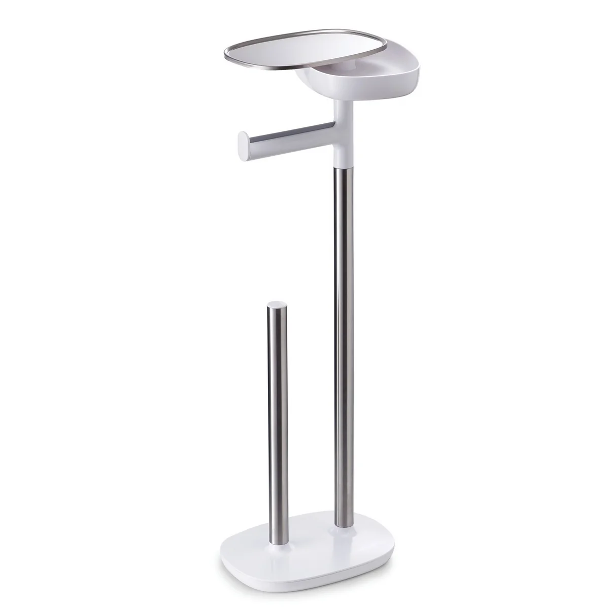 Der EasyStore Toilettenpapierhalter von Joseph Joseph überzeugt mit elegantem Design und vielseitiger Einsetzbarkeit. Der freistehende Halter kann nahe dem WC platziert werden und ist neben dem klassischen Rollenhalter zudem mit einer Vorratsstange für drei weitere Rollen ausgestattet. Den Abschluss des 68 cm hohen Toilettenpapierhalters bildet eine kleine Ablage, auf der beispielsweise ein Buch oder das Handy seinen Platz findet. Währenddessen befindet sich in der geschwungenen Unterseite ein geheimes Aufbewahrungsfach, in dem Hygieneartikel bequem in Reichweite und diskret verstaut werden können.