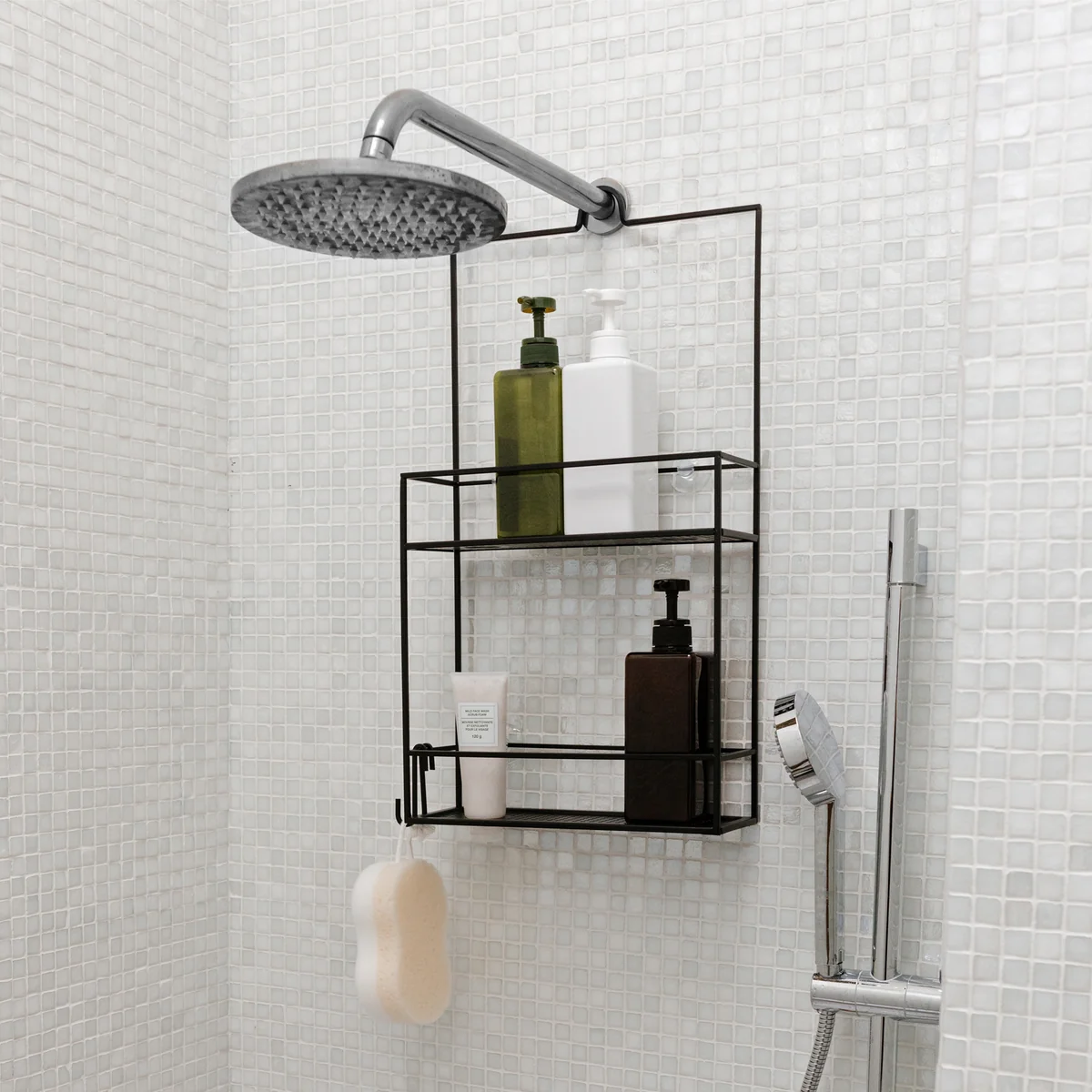 In der Ablage aus Stahl und an den Haken finden Shampoo, Duschgel, Rasierer, die Duschhaube, der Schwamm und vieles mehr einen schönen Platz. Dabei nimmt die Ablage nur wenig Platz ein und sorgt für zusätzlichen Stauraum im Badezimmer. Besonders praktisch sind die perforierten Ablagen, die das Wasser schnell abfließen lassen. In die großen Löcher können Shampoo Flaschen auf den Kopf gestellt werden und sind so auch mit nassen Händen einfach zu bedienen.