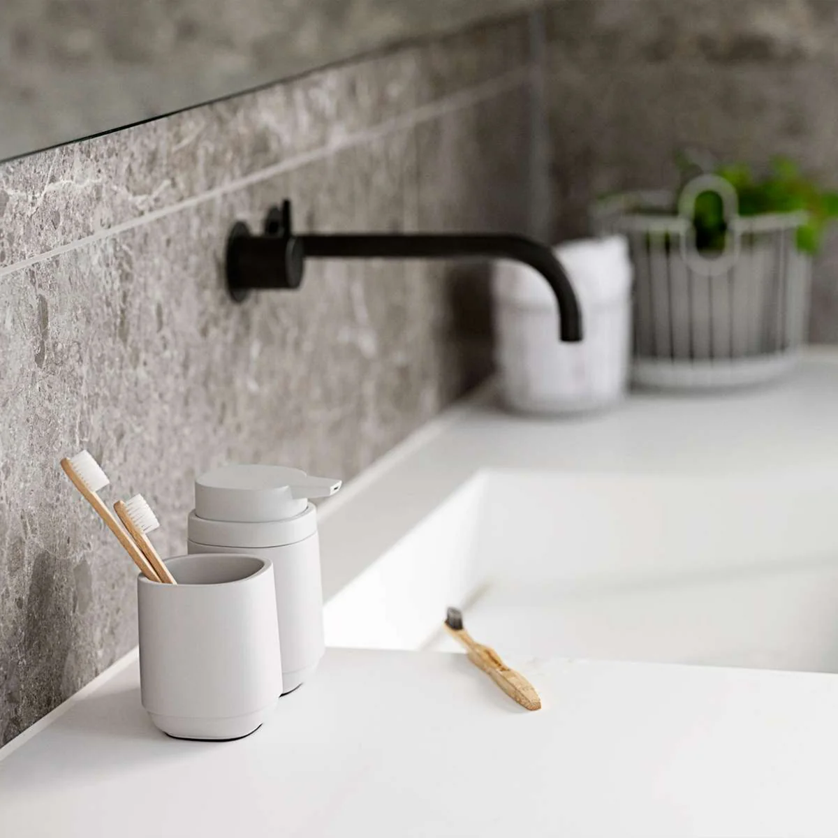 Er ist in den neutralen Farbtönen Schwarz, Soft Grey und Concrete erhältlich, die eine vielseitige Auswahl bieten. Der Becher bietet ausreichend Platz für Zahnbürsten, Zahnpasta und andere Badezimmerutensilien. Dank seines stabilen und standfesten Designs bleibt der Zahnputzbecher sicher auf dem Waschtisch oder der Ablage stehen. Die Zone Denmark - Time Zahnputzbecher ist eine praktische und ästhetische Ergänzung für Ihr Badezimmer und sorgt für Ordnung und Stil in Ihrem täglichen Pflegeritual.