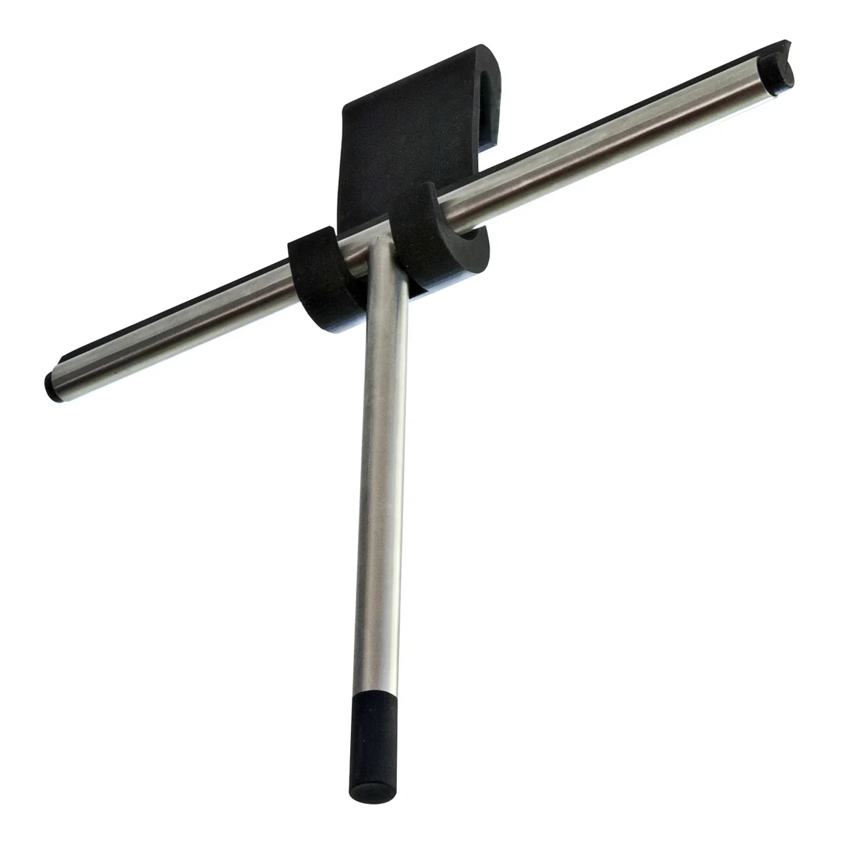 Am Ende des abgerundeten Griffs ist der Edelstahl noch einmal mit schwarzem Gummi verstärkt. Das Silikongummi zum Abziehen zieht sich entlang der kompletten Länge des Abziehkopfs. Der Nova2 Duschabzieher von Frost ist in mattem oder glänzendem Edelstahl erhältlich.