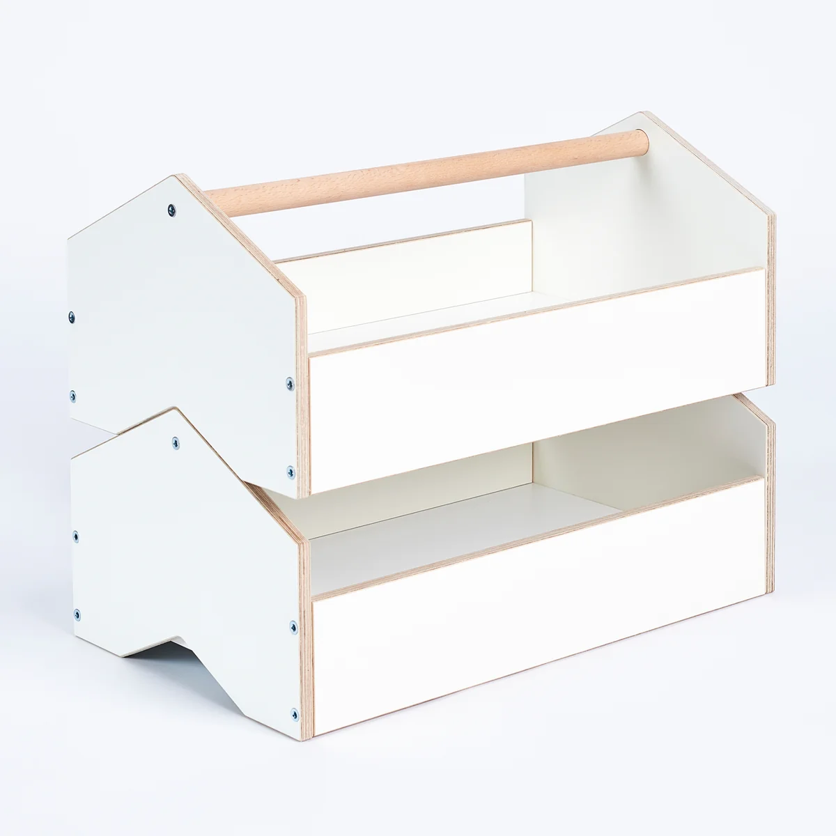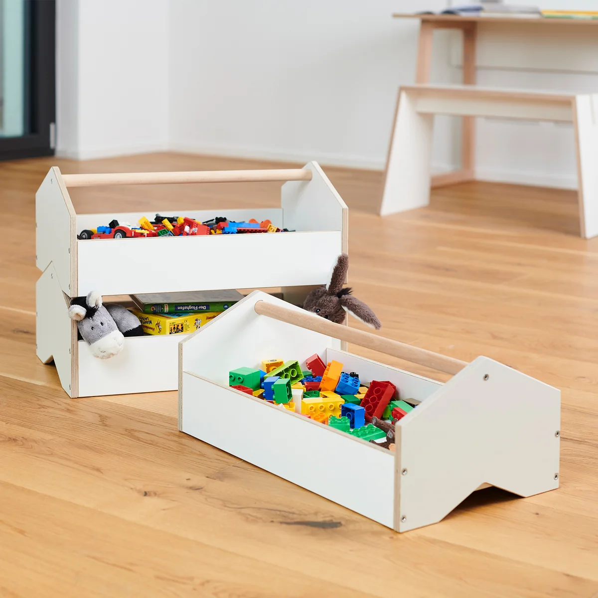 Die kiste Aufbewahrungsbox von Tojo ähnelt einem Werkzeugkasten und dient der Aufbewahrung von kleinerem Spielzeug. Lego-Steine, Figuren, Spielzeug-Autos und kleinere Kuscheltiere finden in der kiste ihren Platz. Die Aufbewahrungsboxen können einfach übereinander gestapelt werden. Das ist besonders platzsparend und ermöglicht jede Menge Stauraum. Sehr praktisch ist, dass der Inhalt auch in den gestapelten Boxen immer griffbereit ist. Durch den großen Griff können die Kisten zudem jederzeit herumgetragen oder neu gestapelt werden.