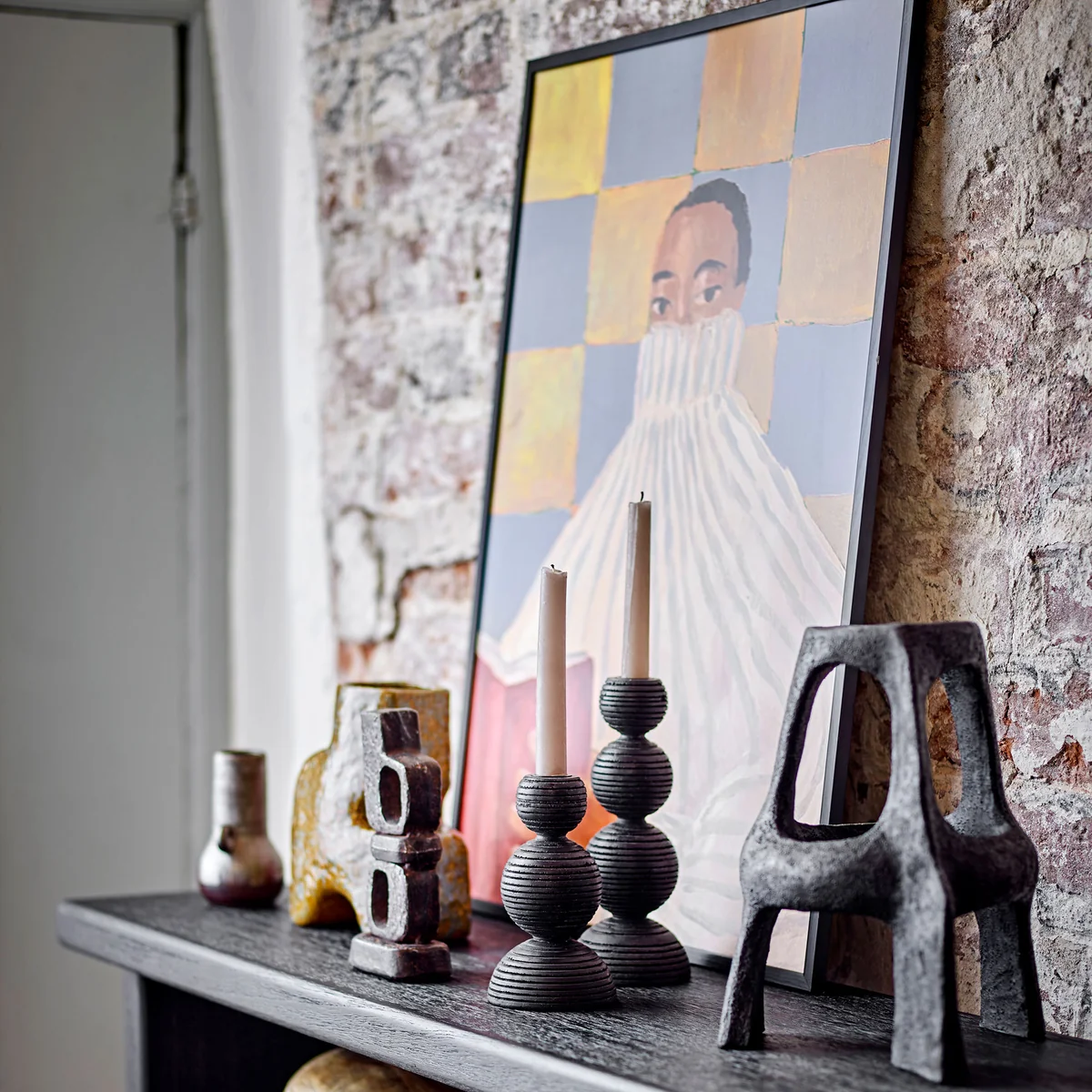 Die Filicia Illustration mit Rahmen vereint warme Farbtöne in Blau, Gelb, Rot und Braun zu einem stimmungsvollen Kunstwerk. Das kreative Motiv wird durch den eleganten schwarzen Kiefernholzrahmen stilvoll eingefasst und fügt sich harmonisch in verschiedene Einrichtungsstile ein.