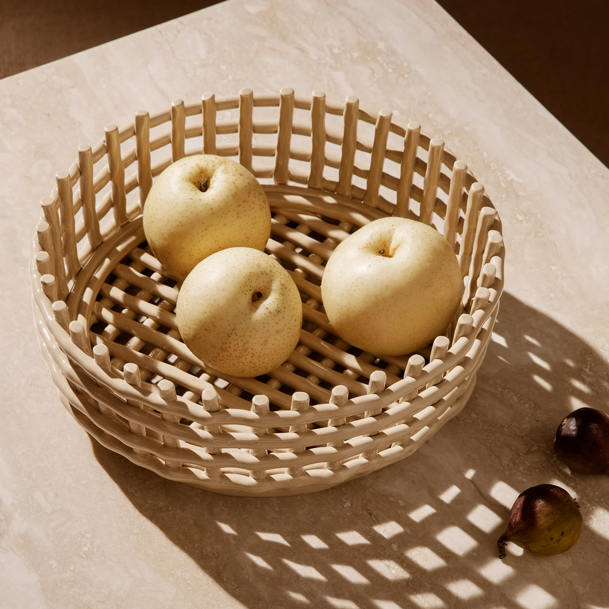 Das Keramik Centerpiece von Ferm Living ist ein einzigartiger Korb für den Esstisch. Er verbindet die traditionelle dänische Handwerkskunst des Korbflechtens mit der Töpferei. Mit seinen dezenten Farben und dem zeitlosen Gitterlook ist er ideal für Esszimmer und Küche geeignet. Das Centerpiece eignet sich als Obstschale, als Brotkorb, für Snacks und Leckereien, oder sogar für die Aufbewahrung persönlicher Gegenstände.