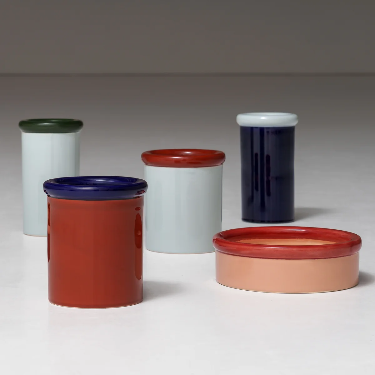 ROD ist eine Familie von handgefertigten und handbemalten Steingutgefäßen, die von Julien Renault entworfen wurden und von den traditionellen Rolltechniken der Töpferei inspiriert sind. Die Vase, das Gefäß und die Schale sind jeweils in zwei einzigartigen Farbkombinationen erhältlich. Sie können einzeln verwendet werden, um einen Blumenstrauß, Küchenutensilien oder Früchte aufzubewahren, oder sie können miteinander kombiniert werden, um eine dekorative Inszenierung zu kreieren."