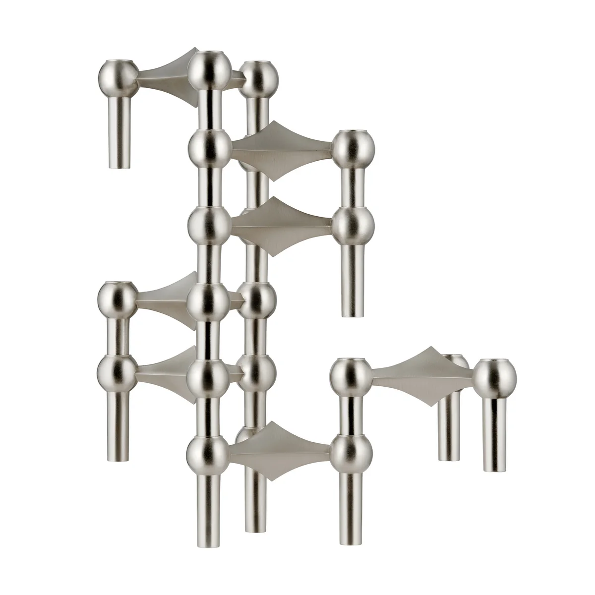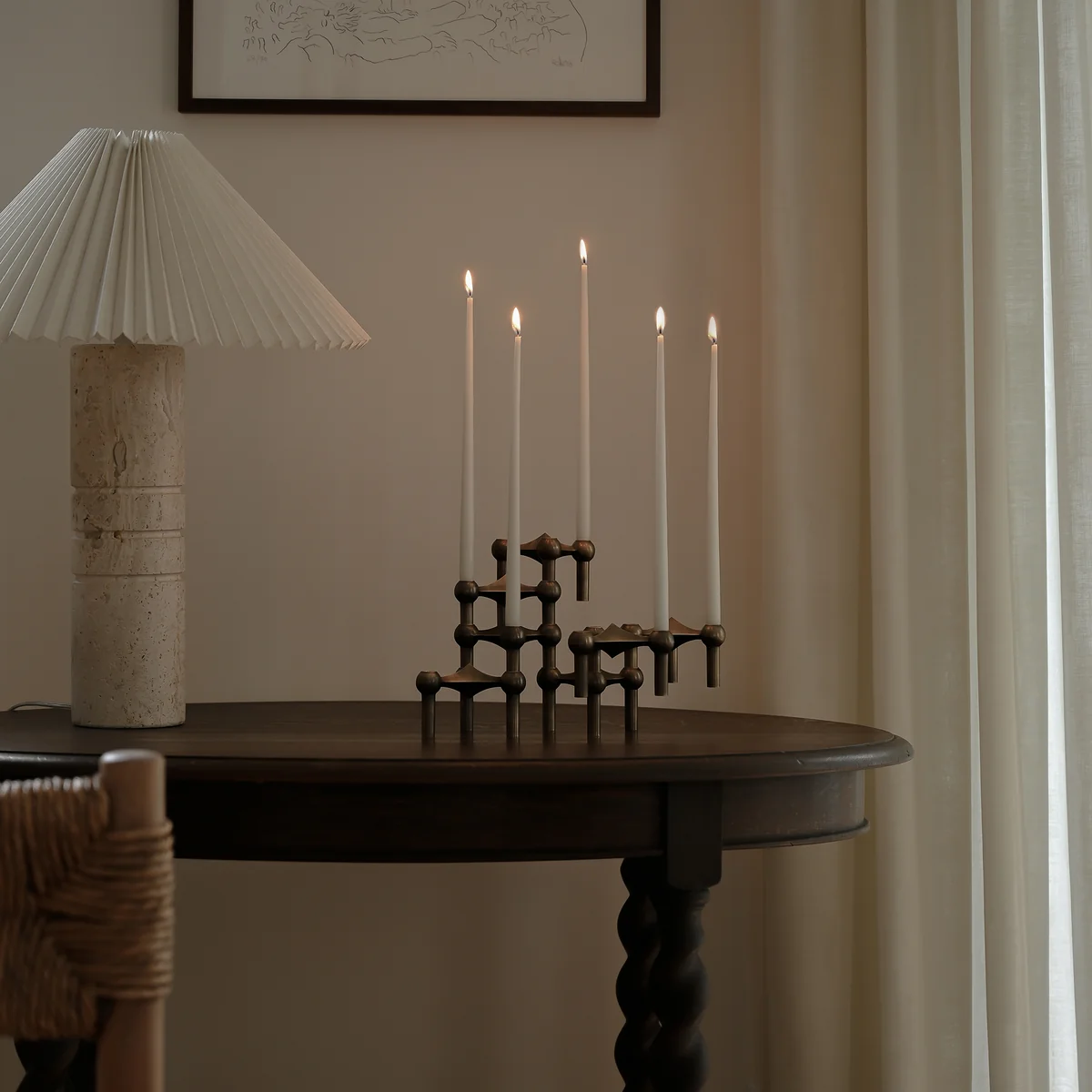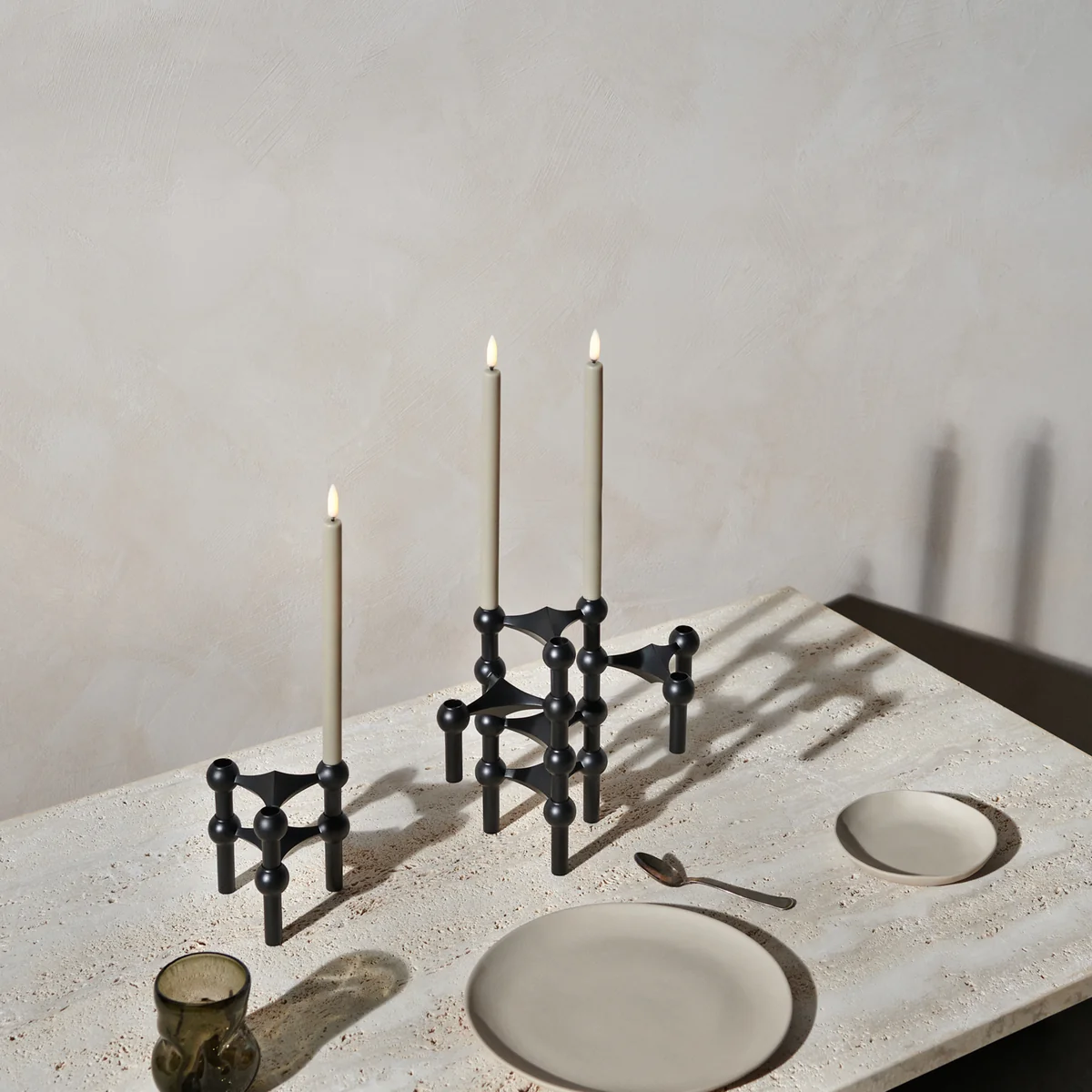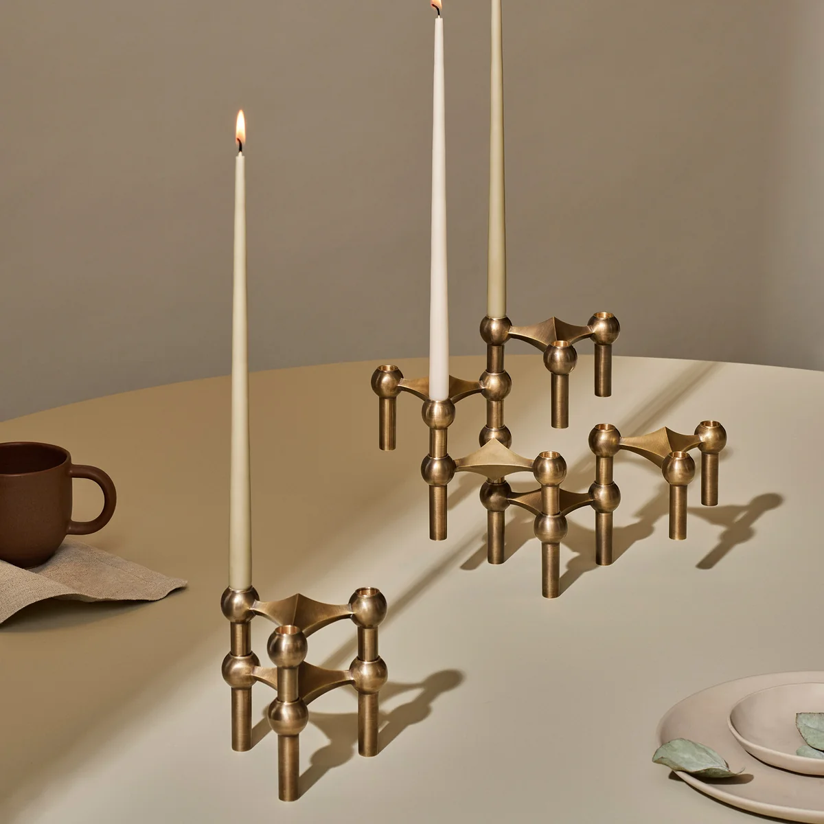 Der klassische Stoff Nagel Kerzenhalter ist eine Design-Ikone aus den 60er Jahren. Der stapelbare Kerzenhalter aus Messing, Chrom oder in mattem Schwarz wird nach Original-Entwürfen gefertigt und begeistert mit seinem zeitlosen Design und seiner unglaublichen Vielfältigkeit.