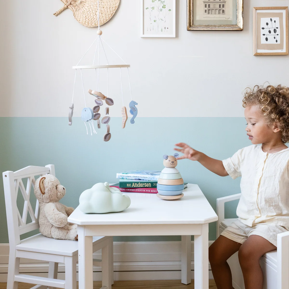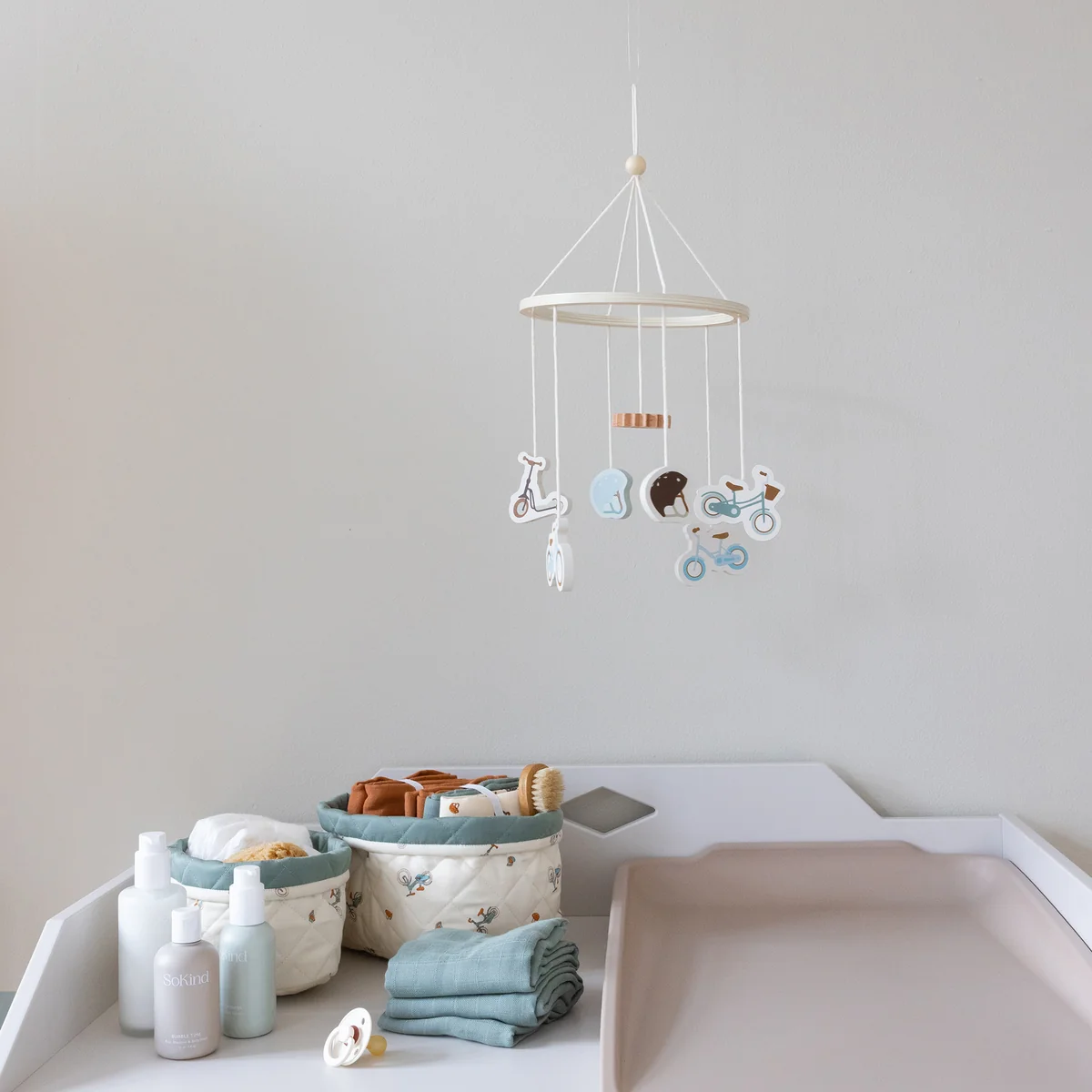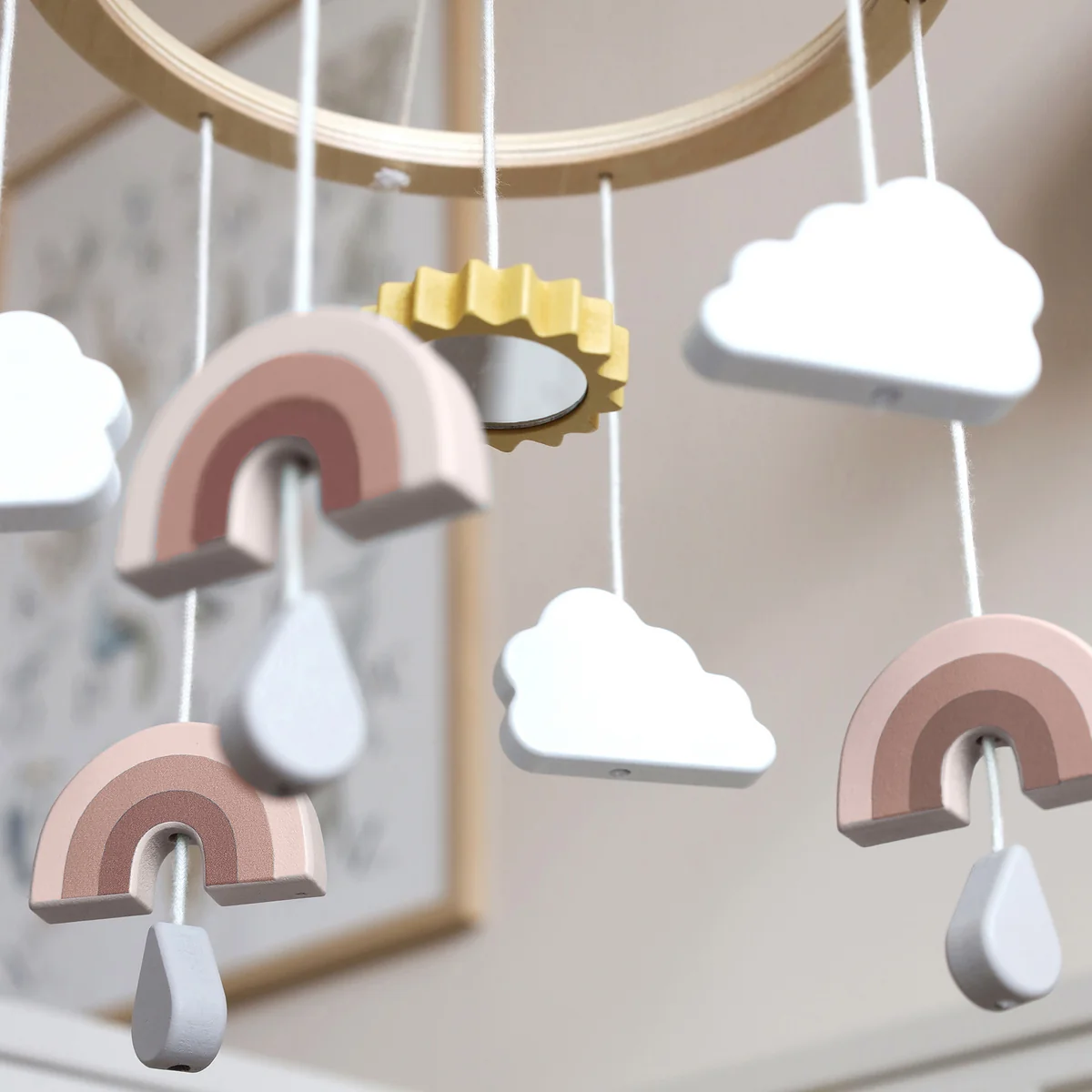 Das Mobile aus Holz aus dem Hause Cam Cam Copenhagen begeistert Groß und Klein mit seinem verträumten Design. In unterschiedlichen Varianten zieren Wolken, Regenbögen und Heißluftballons das natürliche Mobile. Die Sonne im Zentrum des Mobiles verfügt über einen integrierten Spiegel, sodass die Kleinsten auf spielerische Weise sich selbst betrachten können. Das Mobilie aus FSC-Holz kann optimal oberhalb des Kinderbettes anmontiert werden.