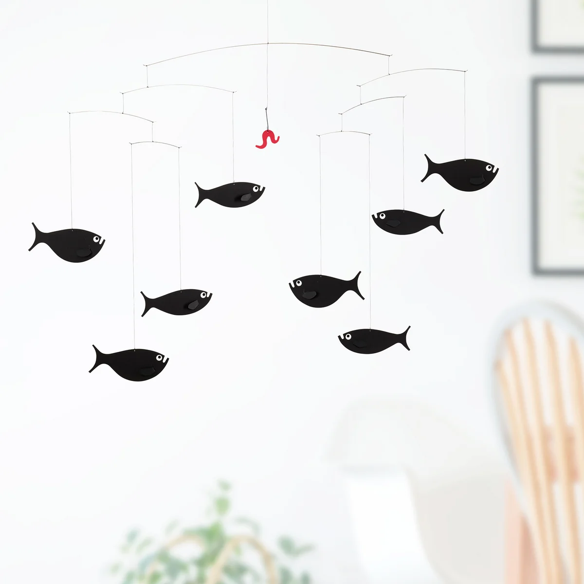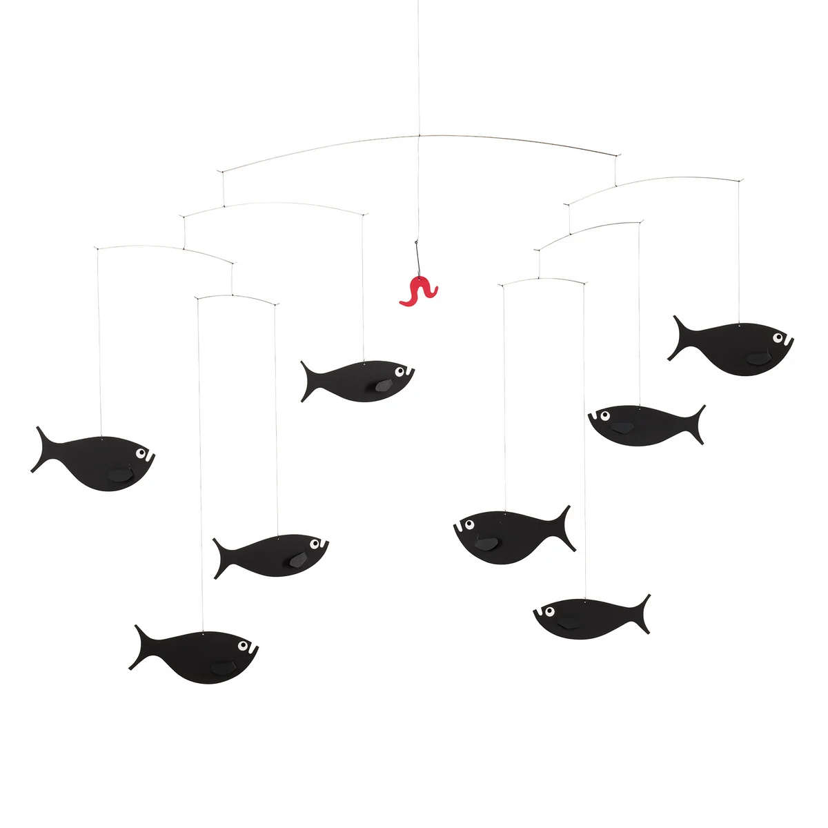 Das Shoal of Fish Mobile von Flensted Mobiles ist ein liebevoll gestaltetes Mobile im verspielten Look. Acht Fische ziehen ruhe- und kraftvoll ihre Bahnen- wann werden sie den köstlichen Wurm bemerken, der auf dem merkwürdigen Haken so verlockend scheint?