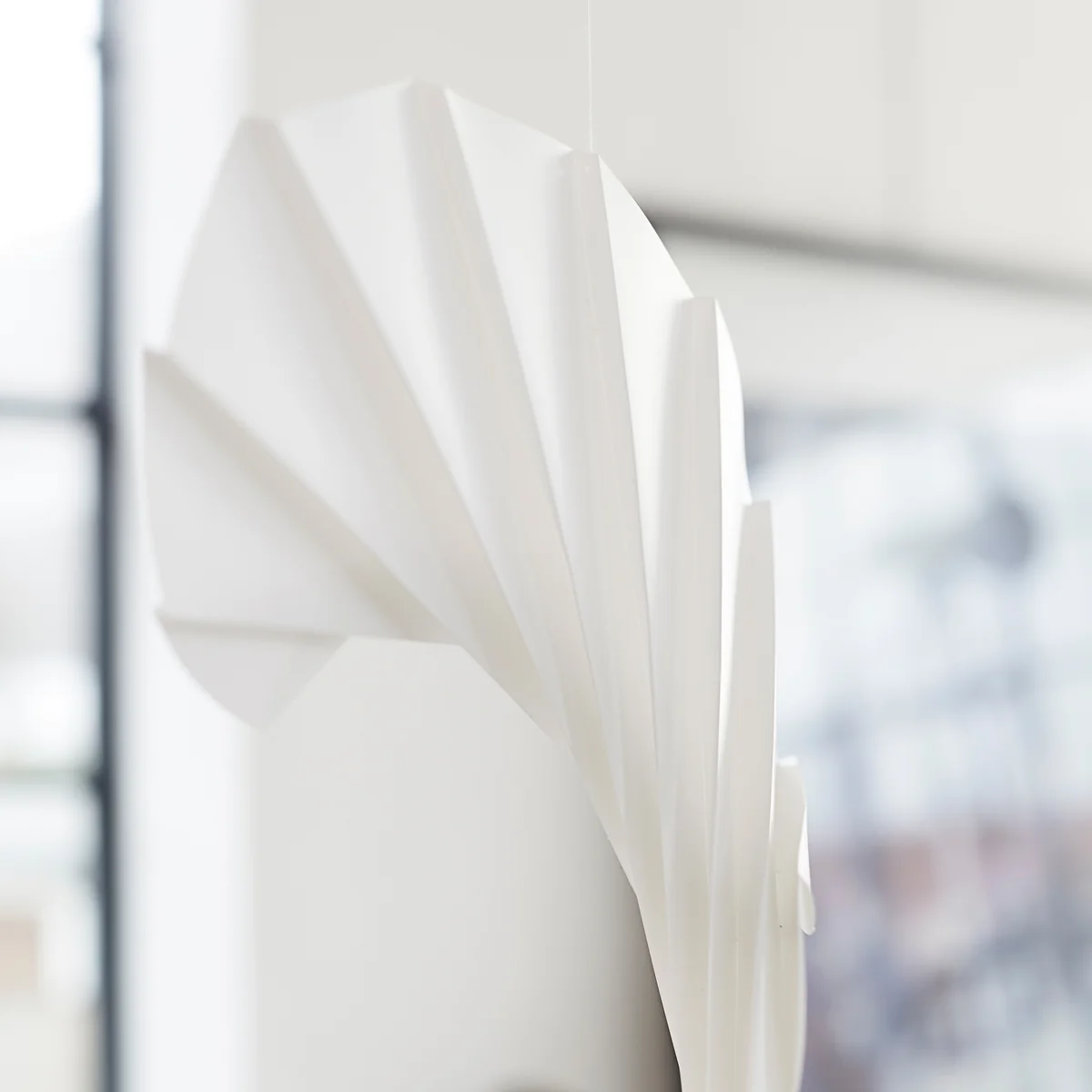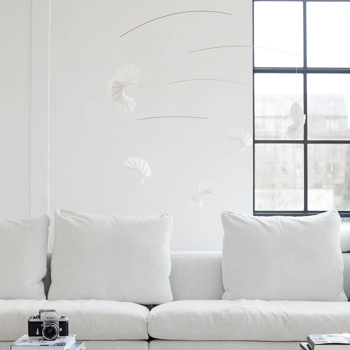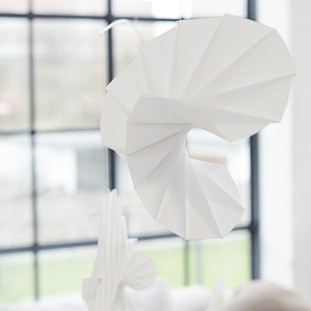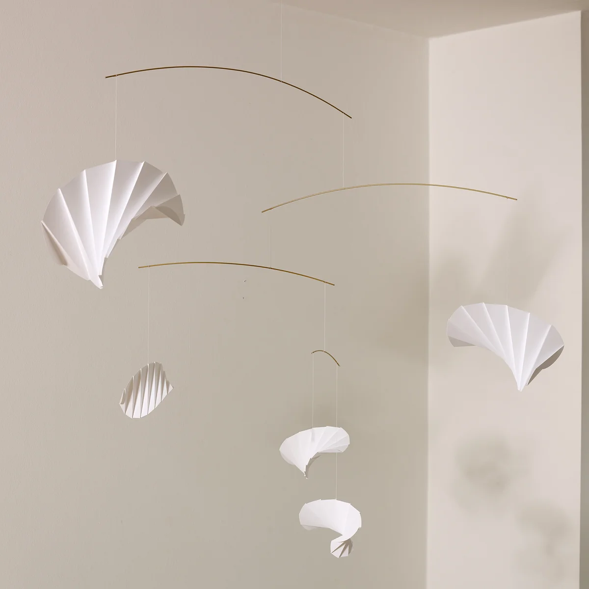 Das Waves Mobile aus dem Hause Flensted Mobiles ist vom Meeren, den Wellen und Muscheln inspiriert. Entworfen von Carina Caia für den dänischen Hersteller. Das Waves Mobile ist von Hand gefaltet und wird aus Siebdruckfolie (weißem Kunststoff) gefertigt. Es wird an vergoldeten Edelstahlstangen aufgehängt.