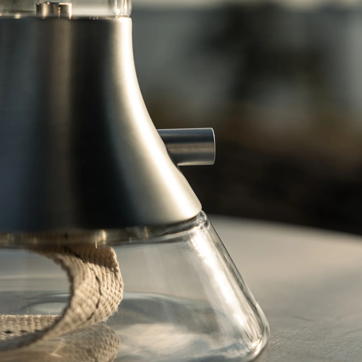 Die Fyr Öllampe hat einen stattlichen kegelförmigen Fuß, eine robuste Taille für den zylindrischen Docht und einen zylindrischen Glastrichter für die brennende Flamme. Mit dem kräftigen, aber schlanken Knopf kann die Flamme eingestellt und die Lampe zum Transport gekippt werden. Die vollständig transparente Glassockel zeigt den verbleibenden Lampenölstand an und ermöglicht die Kontrolle der Wickelbewegung beim Drehen des Knopfes.