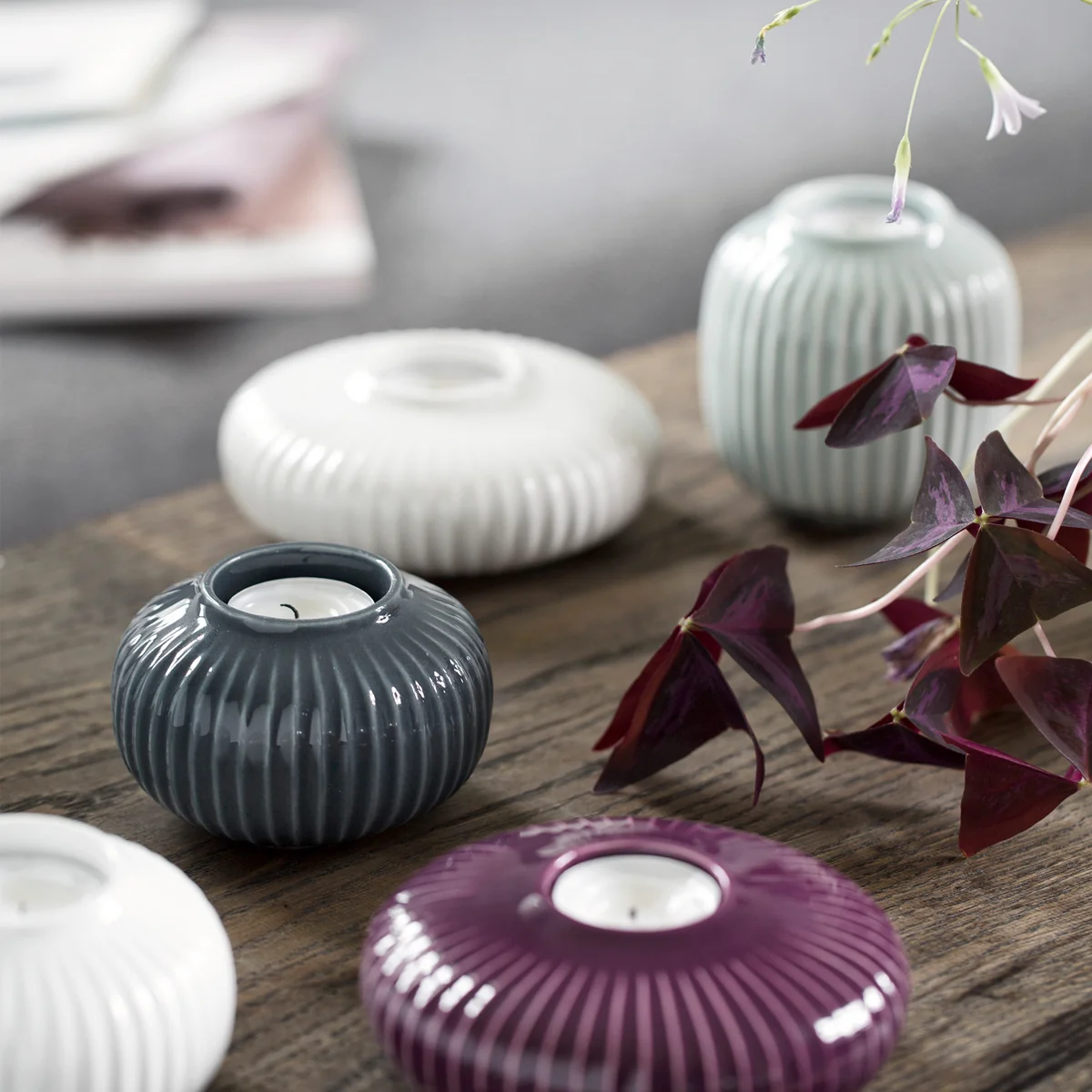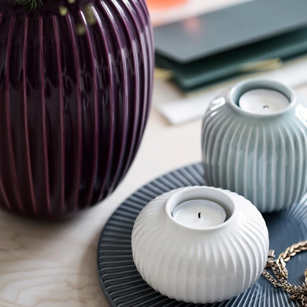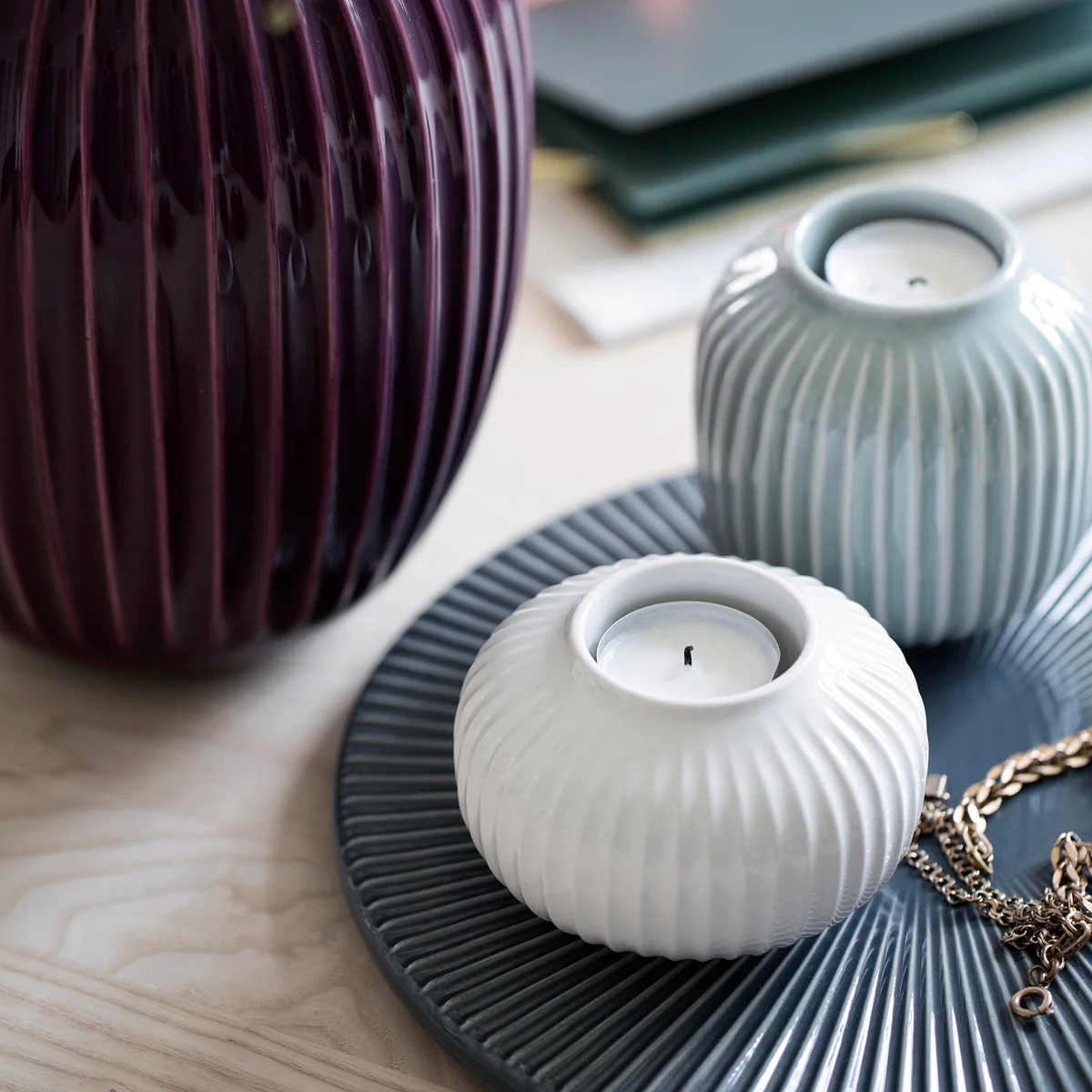 Die charakteristischen Rillen von Hammershøi finden sich auch in dem Teelichthalter von Kähler wieder und in allen anderen Objekten der Serie, ganz gleich, welche Farbe, Form oder Funktion die Artikel auszeichnen.