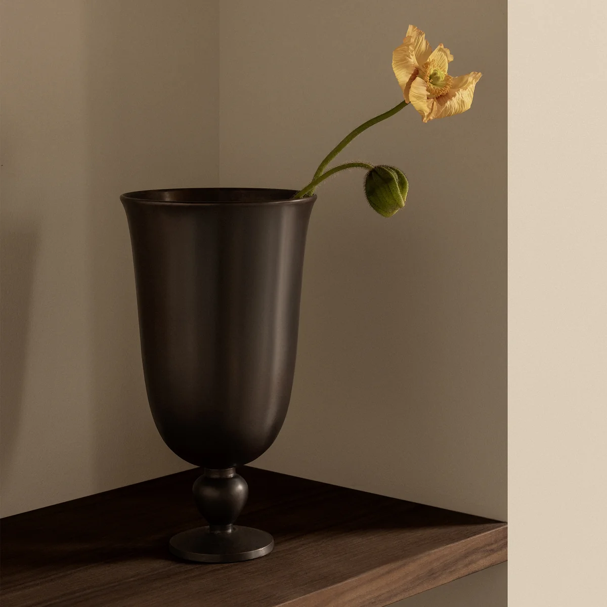 Die Pavot Vase von Audo verbindet antike Einflüsse mit modernem Design und verleiht jedem Raum eine elegante, geschichtsträchtige Note. Gefertigt aus Aluminium und mit einer charakteristischen bronzebraunen Patina veredelt, erinnert die Form des Fußes an eine filigrane Mohnkapsel – eine subtile Hommage an die organische Schönheit der Natur, die der Vase ihren französischen Namen verleiht.