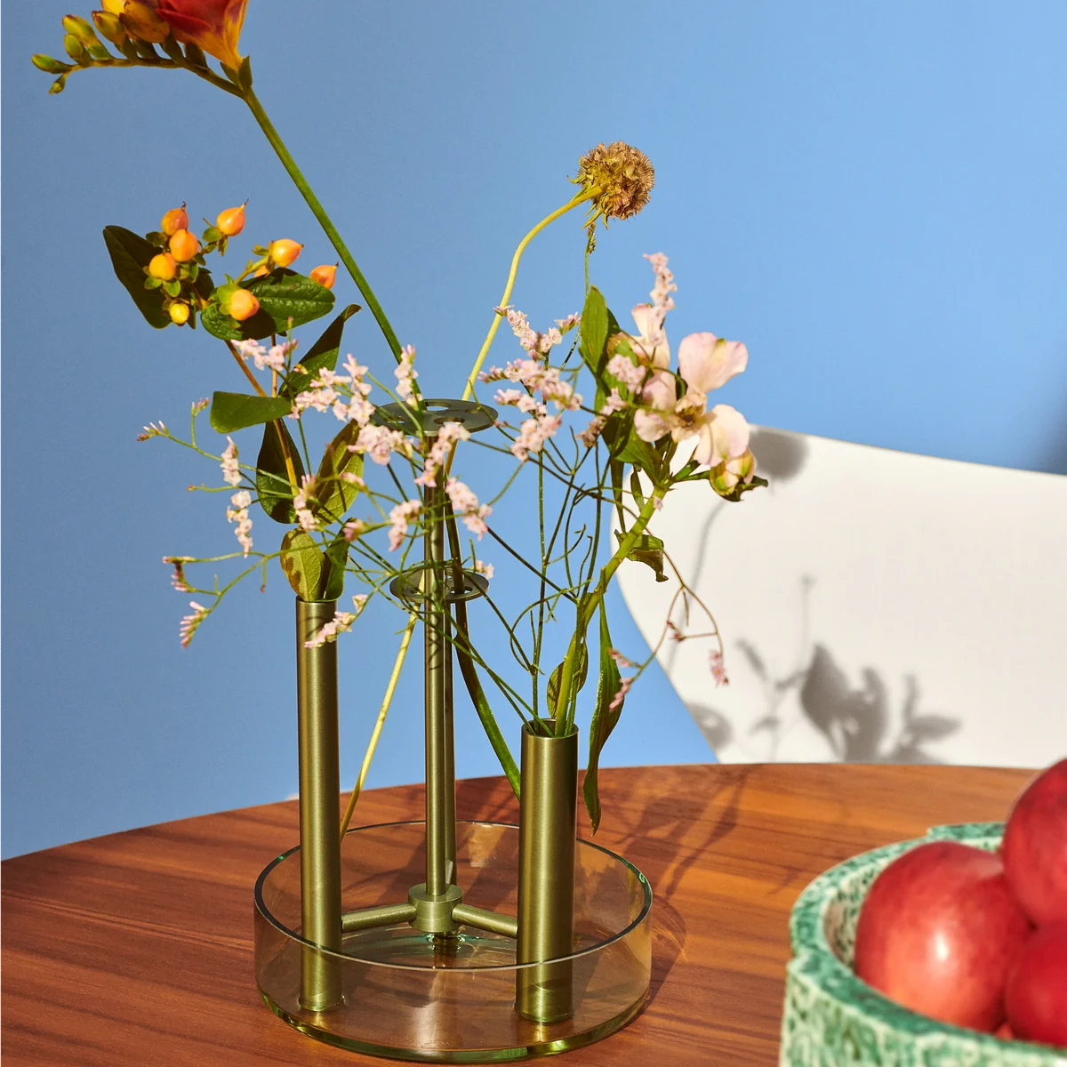 Die Wasserschale der Ikeru Vase besteht aus waldgrünem Glas, die Röhren und das Gestell aus Aluminium. Die Ikeru Vase Low ist auch in einer hohen Variante erhältlich.