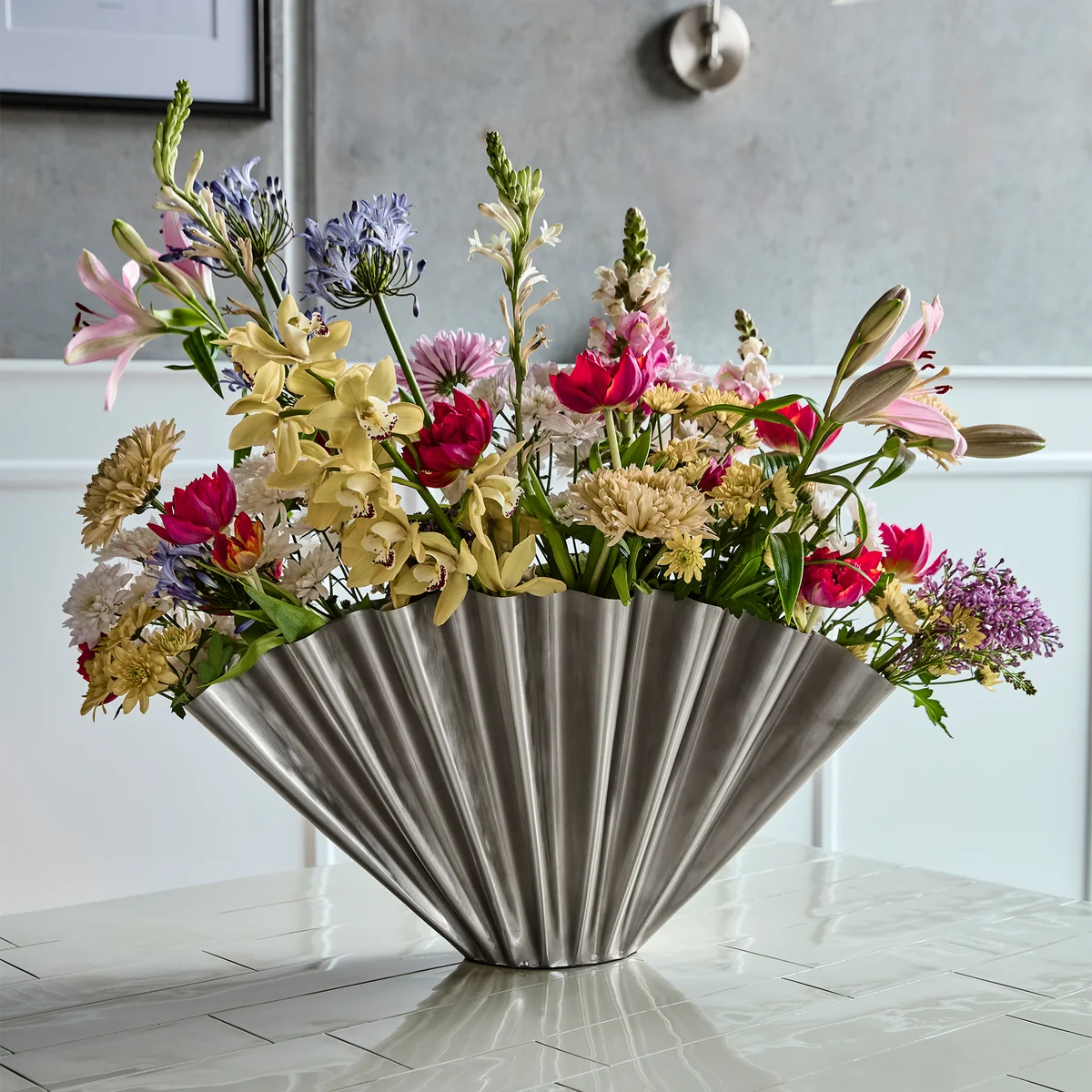 Die dynamischen Falten der Vase sind nicht nur dekorativ, sondern unterstützen die Stränge der Blumen. So können in der Vase sowohl einzelne Blumen und Sträucher als auch üppige Blumensträuße stilvoll arrangiert werden.