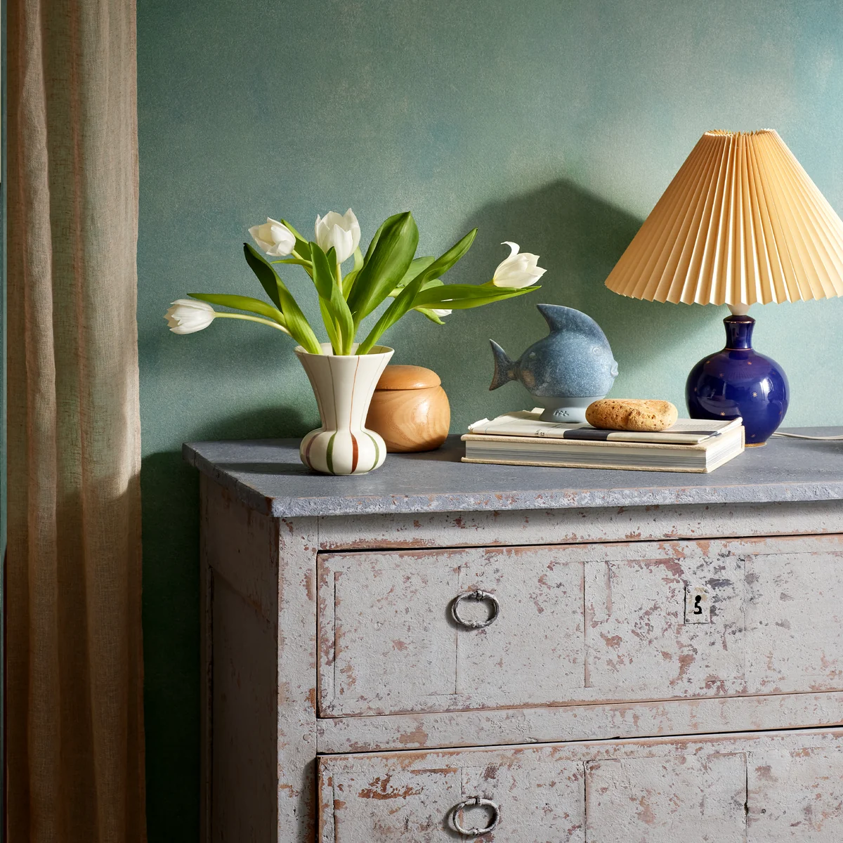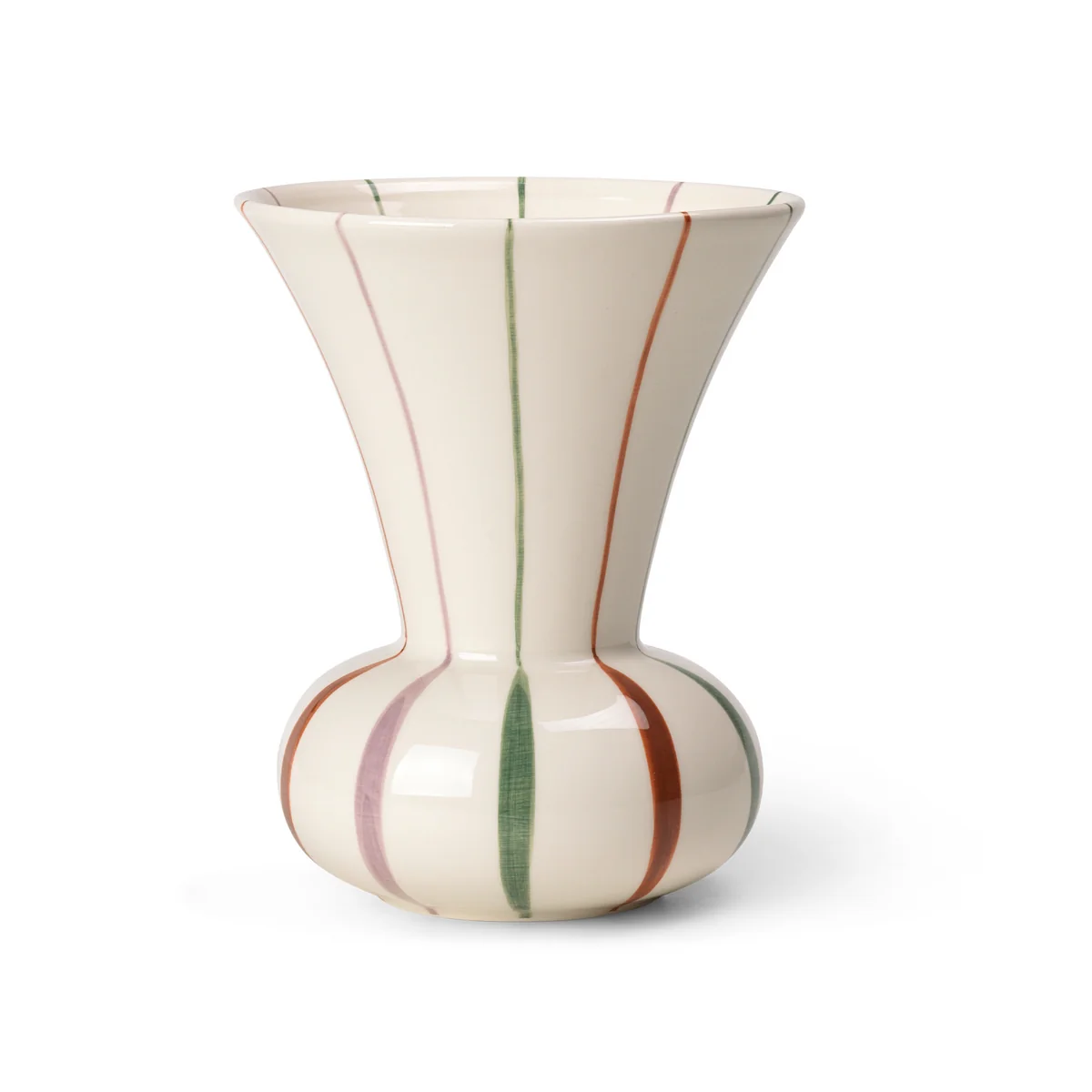 Ein humorvolles Detail sind die charakteristischen Linien, die sich über den Rand hinweg bis ins Innere der Vase erstrecken. Das ist nicht nur elegant und überraschend, sondern verleiht dem Design auch eine neue Dimension, da die Form sowohl innen als auch außen akzentuiert wird. Die Vase ist aus Keramik gefertigt und handbemalt. Das trägt zu der Lebendigkeit des authentischen Charmes bei, der außerdem durch die grafische Interpretation von Blumen und Samenköpfen auf den Vasen entsteht.