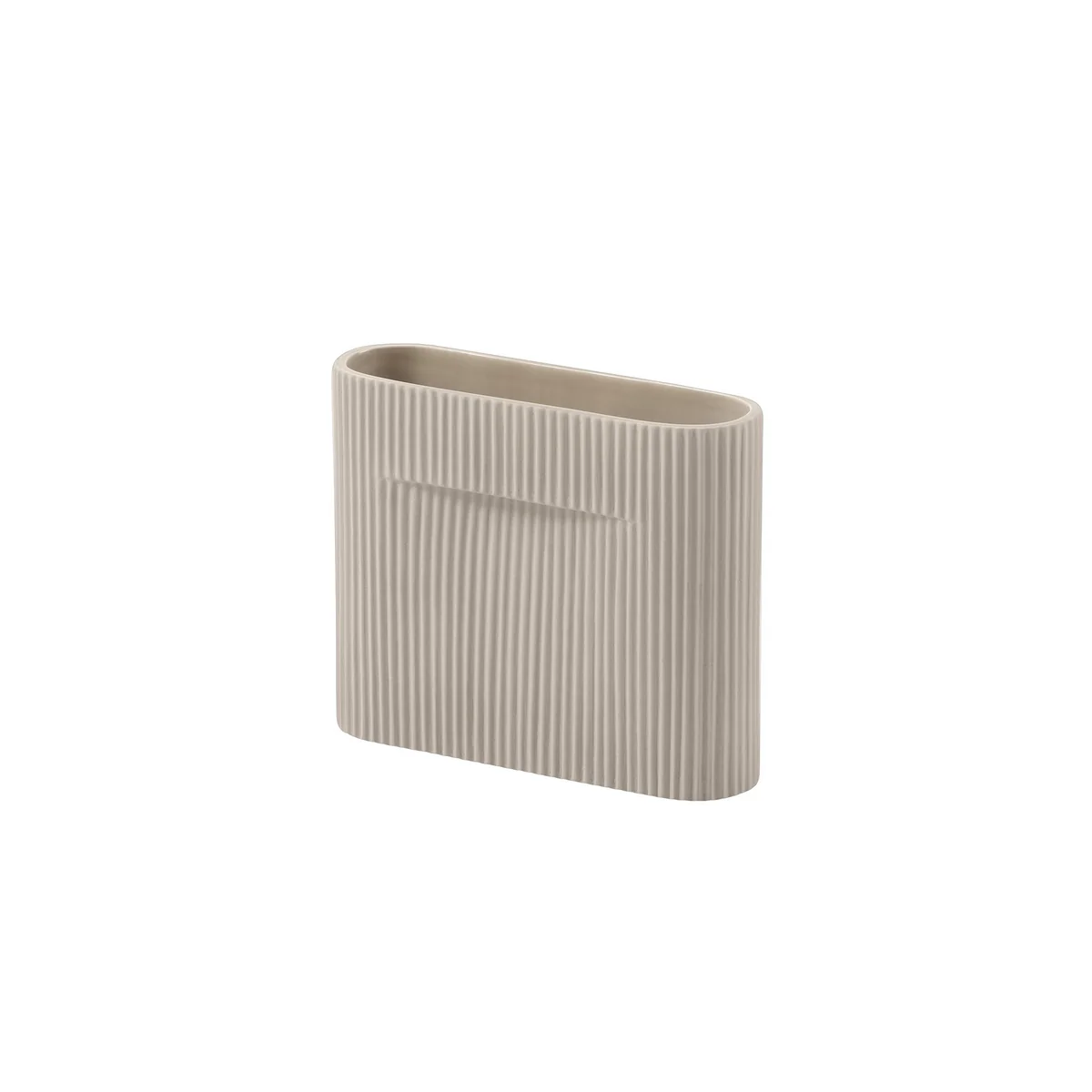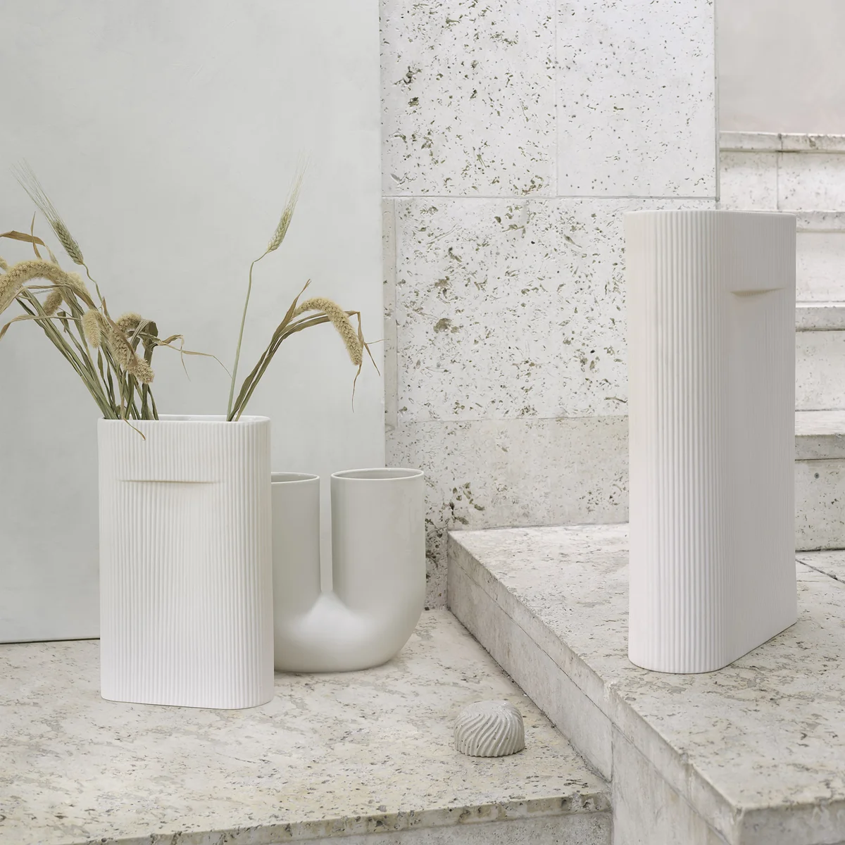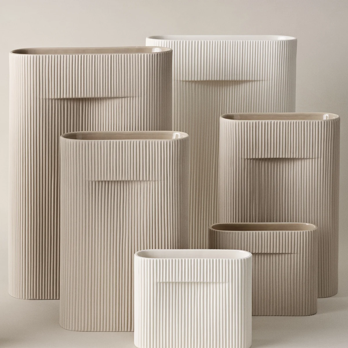 Die Ridge Vasen werden aus Terrakotta oder Steingut hergestellt und sind in verschiedenen Ausführungen und Farben erhältlich. Sie sind nicht spülmaschinenfest und sollten per Hand gereinigt werden.