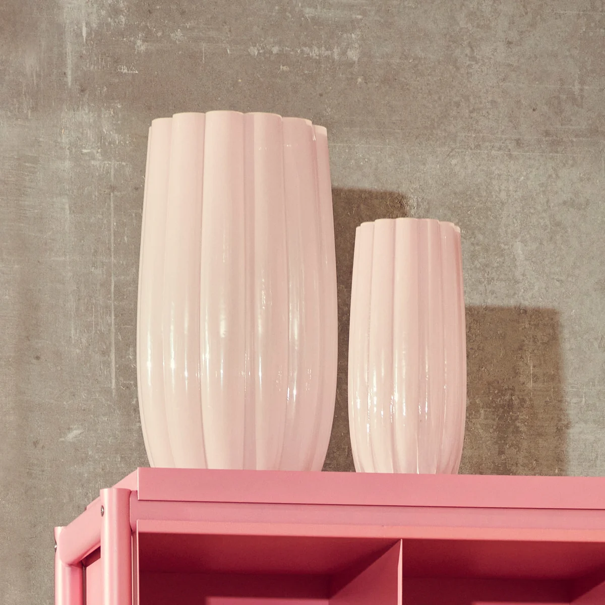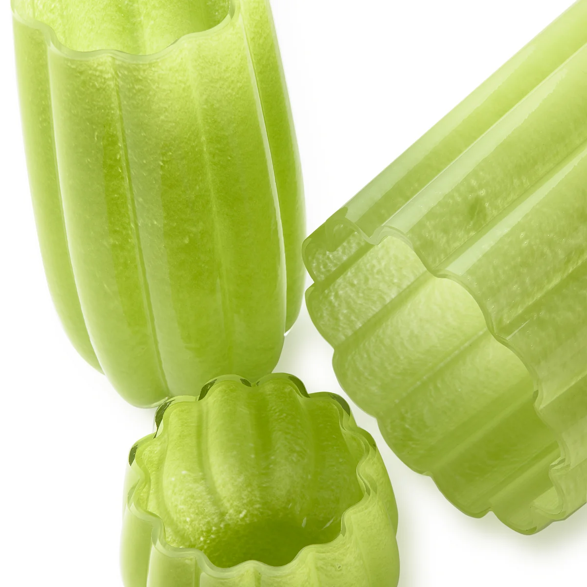 Die Melon Vase aus dem Hause POLSPOTTEN begeistert mit seiner rundlichen Form und den frischen Farben. Melon wurde in Zusammenarbeit mit Floristen entwickelt, die Vase aus Glas wirkt aber auch ohne Blumenarrangements überaus kunstvoll. Die geriffelte Außenseite der Vase erinnert mit seinem Design an traditionelle Terrakottatöpfe.
