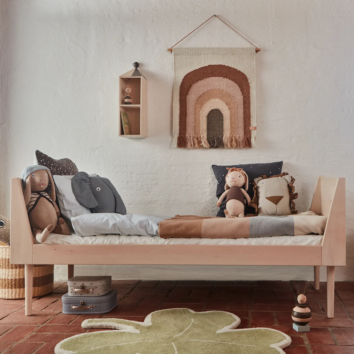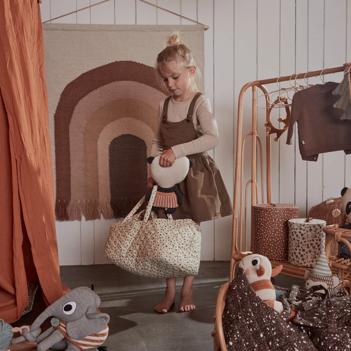 Der Follow the Rainbow Wandteppich von OYOY ist sowohl niedlich als auch verspielt. Der Teppich stellt einen mehrfarbigen Regenbogen dar und besteht aus 95 % Wolle und 5 % Baumwolle.