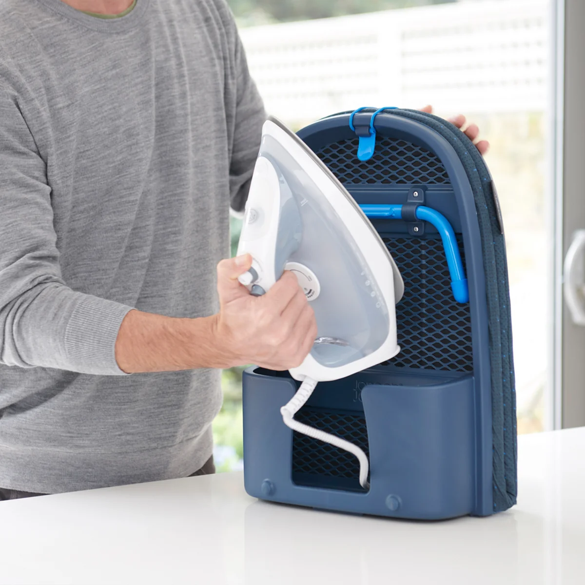 Das Glide Pocket Tisch-Bügelbrett von Joseph Joseph ist eine ideale Option bei wenig Stauraum im Haus oder zum Mitnehmen auf Reisen. Zum einen lässt es sich auf die Hälfte zusammenfalten und dank eines integrierten Hakens ebenso kompakt wie einfach an eine Wand oder Tür hängen. Es verfügt zudem über ein spezielles Fach zur Aufbewahrung des Bügeleisens, das wertvollen Platz spart und alles, was für die Bügelarbeiten benötigt wird, zusammen an einem Ort verstaut.