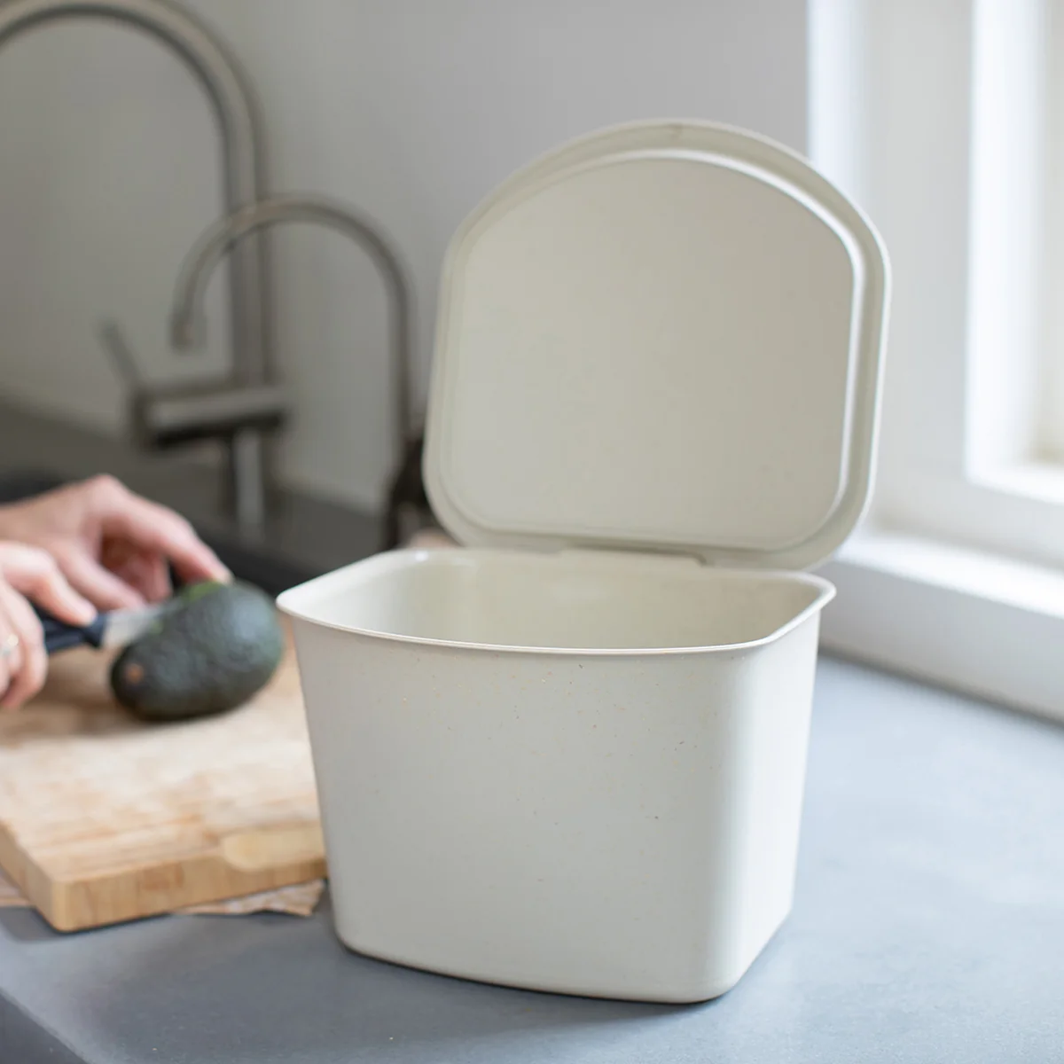 Die gesammelten Küchenabfälle wie ausgepresste Orangen, Eierschalen und Salatblätter können dann zum Kompostieren verwendet oder einfach in einen größeren Abfalleimer ausgeleert werden. Die Abfalleimer lassen sich in der Spülmaschine reinigen.