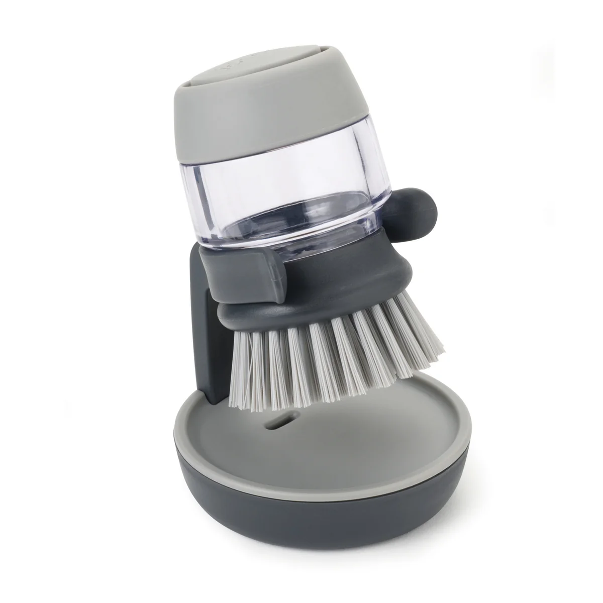 Mit der Palm Scrub Spülbürste von Joseph Joseph wird das Abwaschen zum Kinderspiel. Ihre kratzfesten Borsten sorgen für saubere Töpfe, Pfannen und Geschirr. Die Bürste verfügt zudem über einen leicht zu befüllenden Spülmittelspender, der auf Knopfdruck die richtige Menge an Spülmittel ausgibt. Zu der Bürste gehört ebenso ein Ständer, in dem die Bürste aufbewahrt wird und Abtropfen kann.