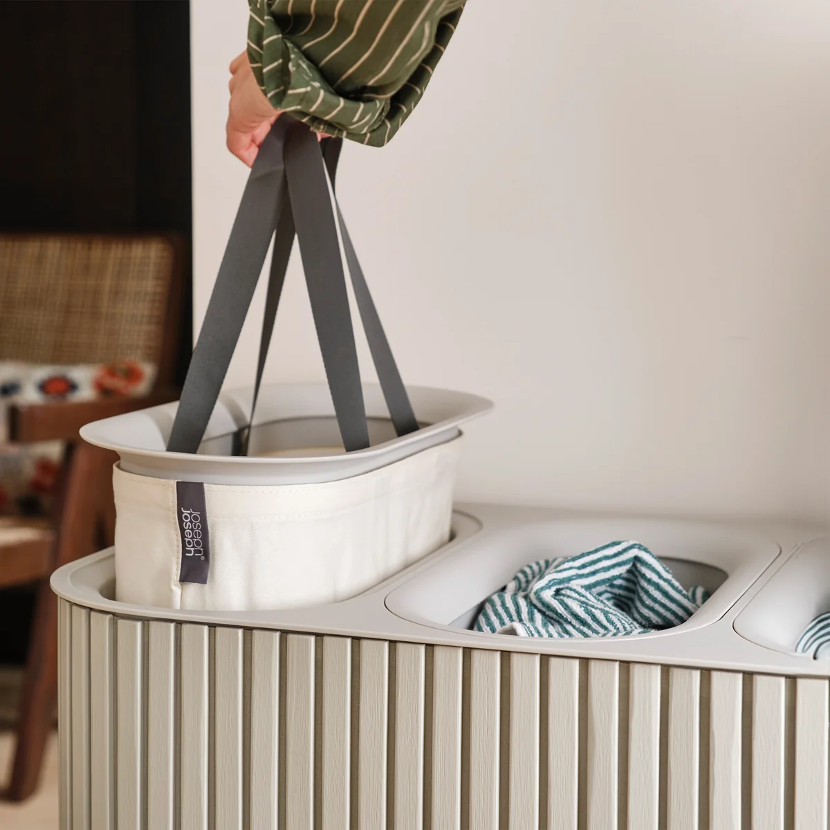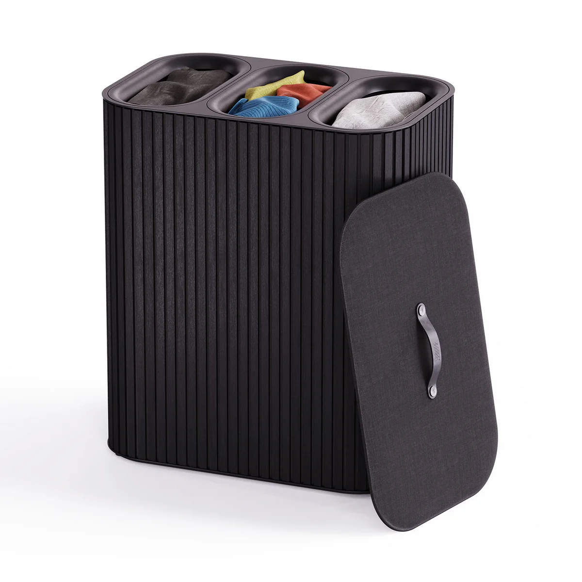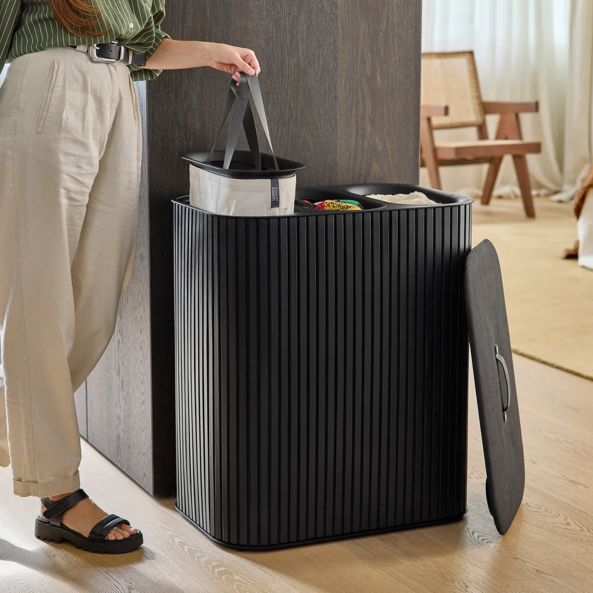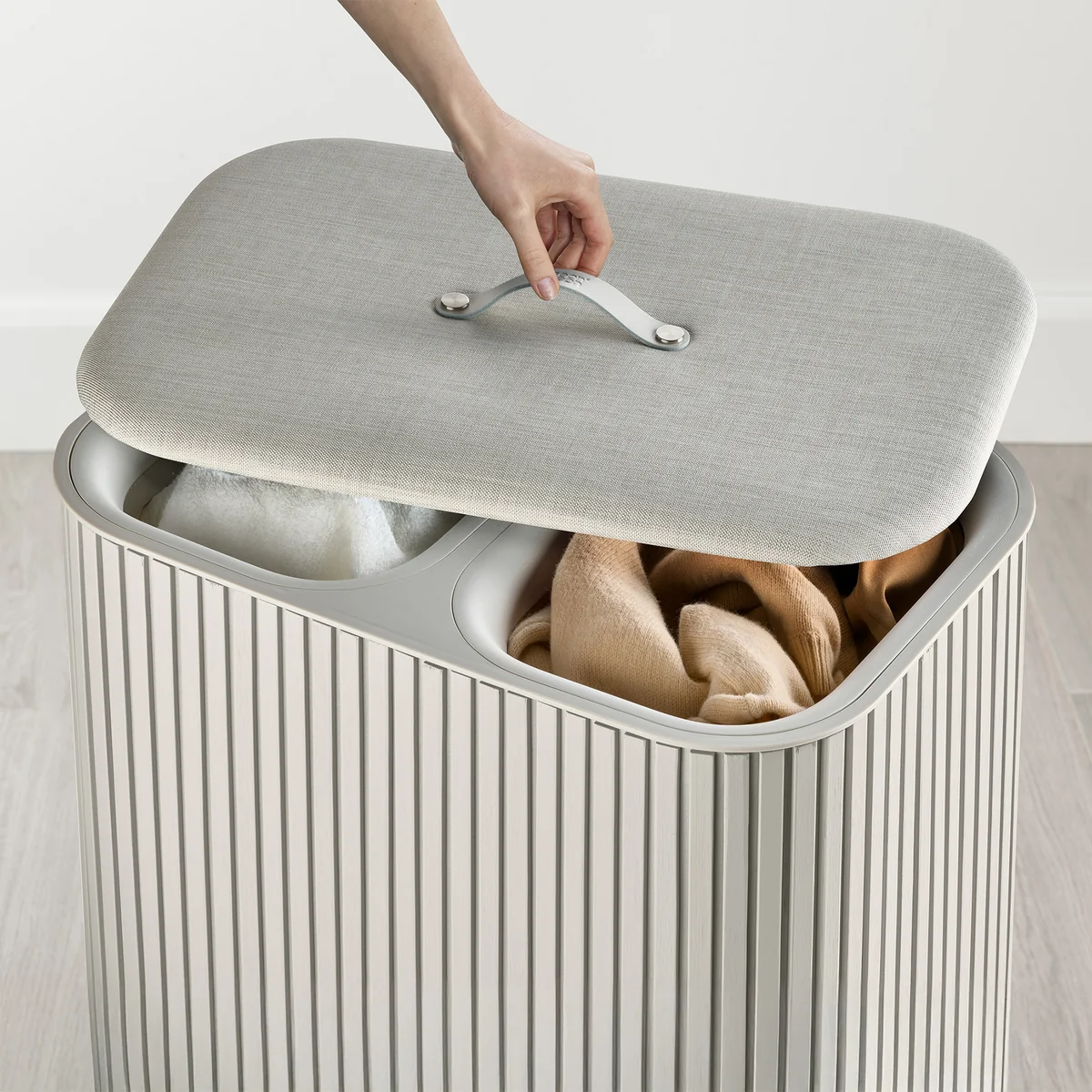 Der Tota Luxe Wäschekorb vereint stilvolle Optik mit hoher Funktionalität. Erhältlich mit zwei 45-Liter- oder drei 30-Liter-Fächern erleichtert er das Vorsortieren der Wäsche nach Farben oder Materialien. Das elegante Äußere aus Bambusholz fügt sich harmonisch in moderne Interieurs ein. Die herausnehmbaren Tragetaschen mit Griffen – oben und unten – machen das Transportieren und Entleeren besonders einfach. Dank Schnellrücklauf-System kehren die Beutel nach dem Waschen automatisch in ihre Position zurück.