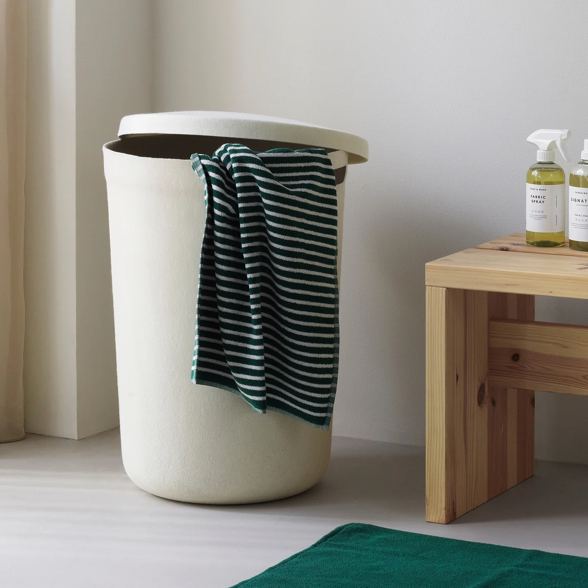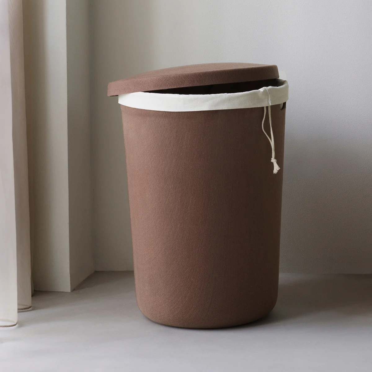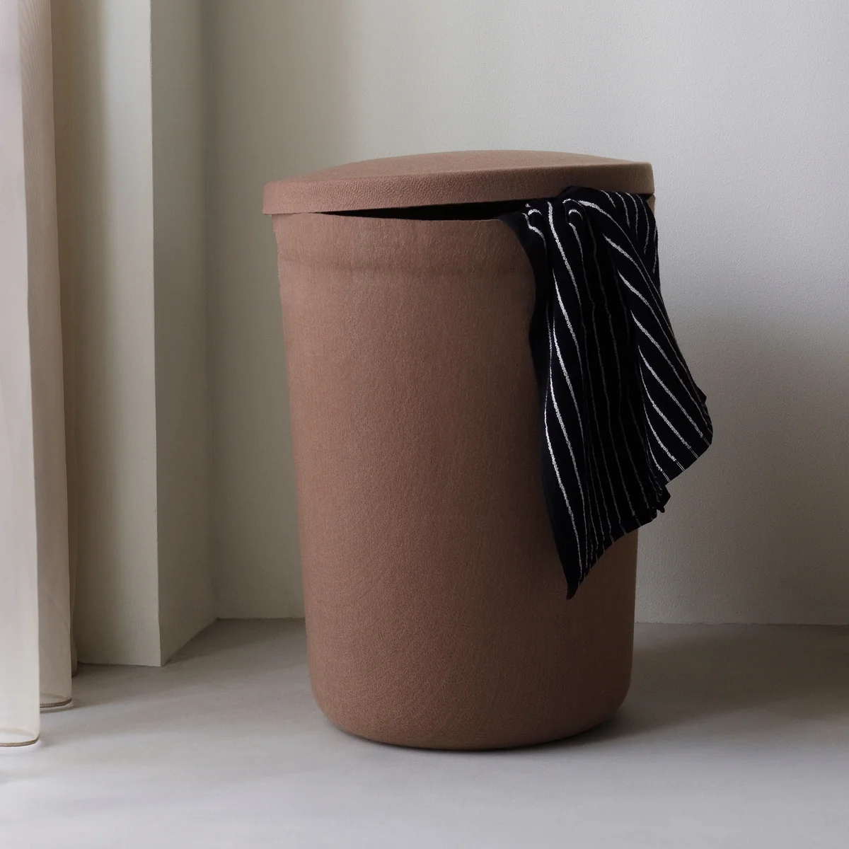 Der Hide Wäschekorb von Normann Copenhagen erweitert die innovative Hide Kollektion um eine stilvolle Lösung für den Alltag. Gefertigt aus robustem PET-Filz aus recycelten Plastikflaschen, vereint sie verantwortungsbewusste Materialwahl mit funktionalem Design. Die längliche, klar definierte Form sorgt für eine elegante Silhouette, während integrierte Griffe ein komfortables Tragen ermöglichen. Ein optionaler Baumwoll-Innensack mit Kordelzug erleichtert den Transport der Wäsche und fügt sich nahtlos in das reduzierte Design ein.
