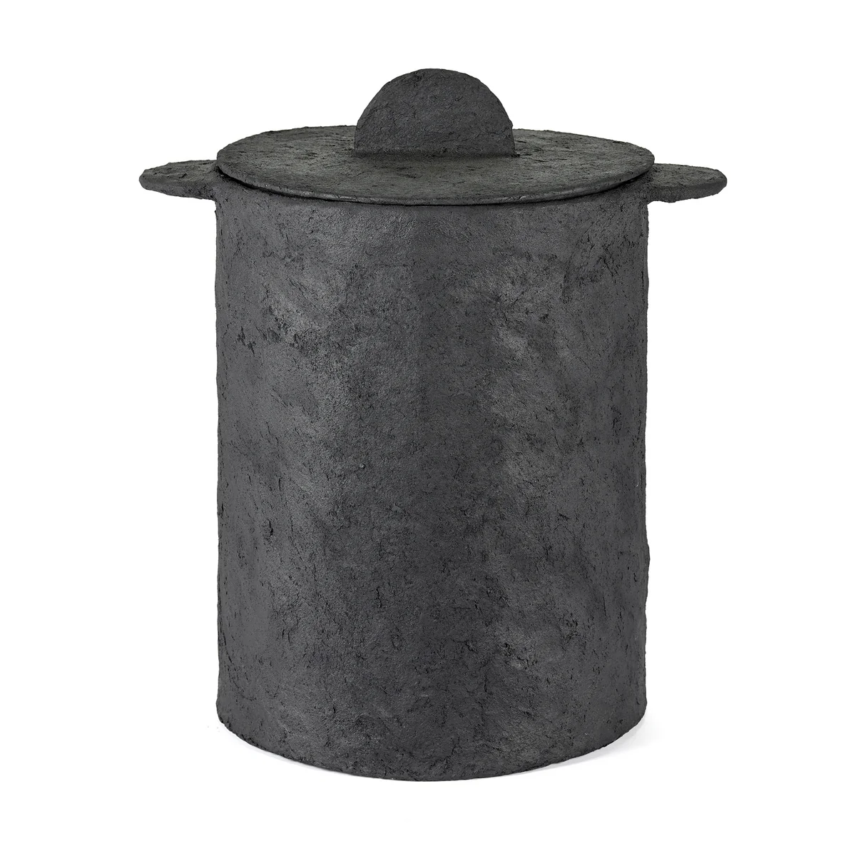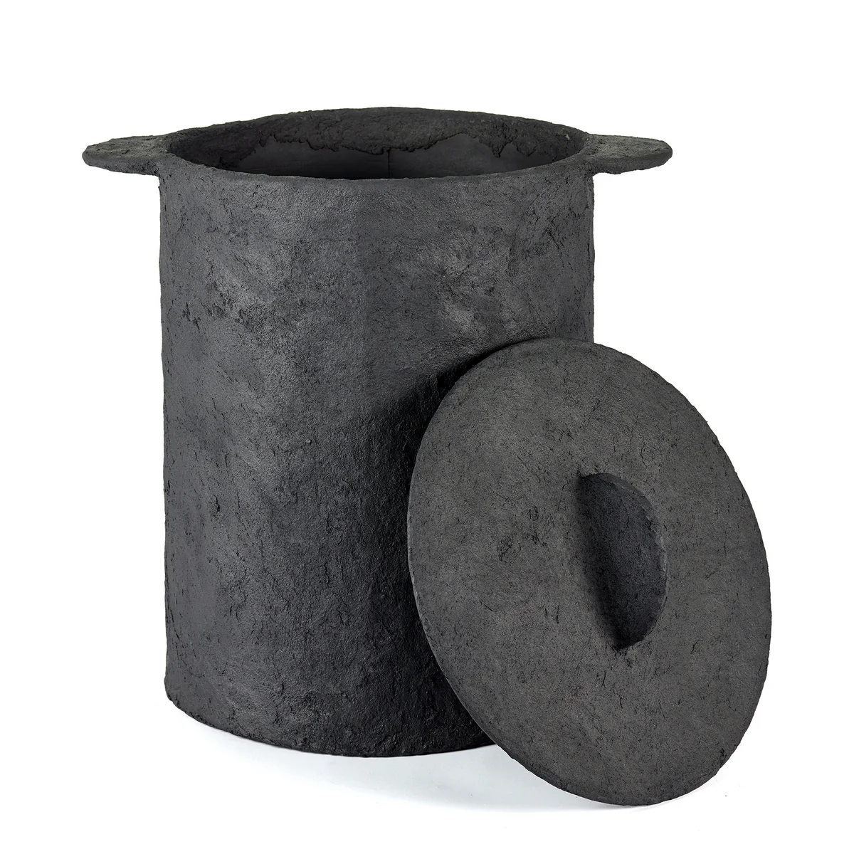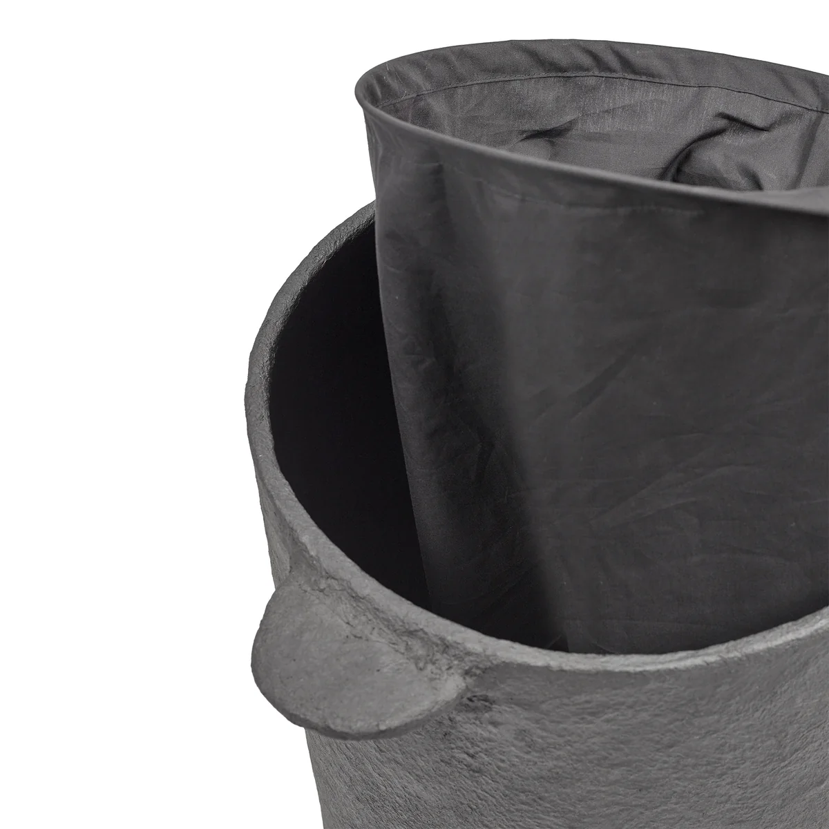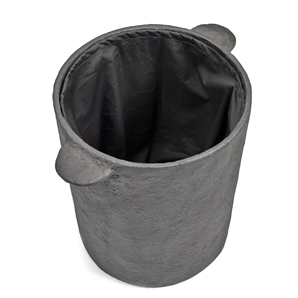 Gefertigt aus Pappmaché im aufwändigen Schicht-um-Schicht-Verfahren, überzeugt der Korb durch seine ausdrucksstarke Struktur und organische Form. Die tiefschwarze Farbgebung unterstreicht das skulpturale Erscheinungsbild und verleiht dem Objekt eine ruhige, fast monumentale Präsenz. Ein herausnehmbarer Leinensack im Inneren sorgt für praktischen Komfort, während der passende Deckel den Inhalt dezent verbirgt – ideal für stilvolles Wohnen mit Liebe zum Detail.