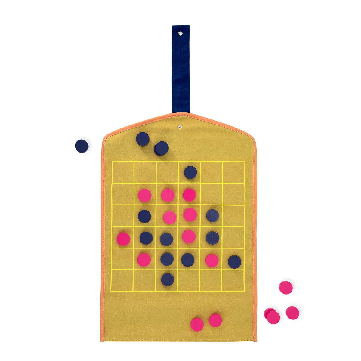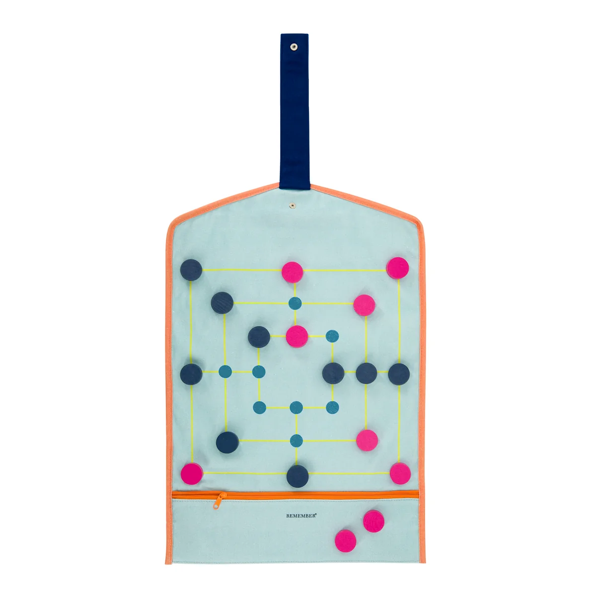 Wie wäre es mit einem Spiel für unterwegs mit Roll-Up von Remember? Dieses textilbasierte Mühle- bzw. Vier-Gewinnt-Spiel aus Baumwolle eignet sich perfekt für lange Autofahrten, Ausflüge in den Park oder einen Tag am Strand. Zur einfachen Mitnahme wird das Spiel einfach zusammengerollt und mit einem Druckknopf verschlossen. Die bunten Spielsteine sind praktischerweise in einer integrierten Tasche verstaut.