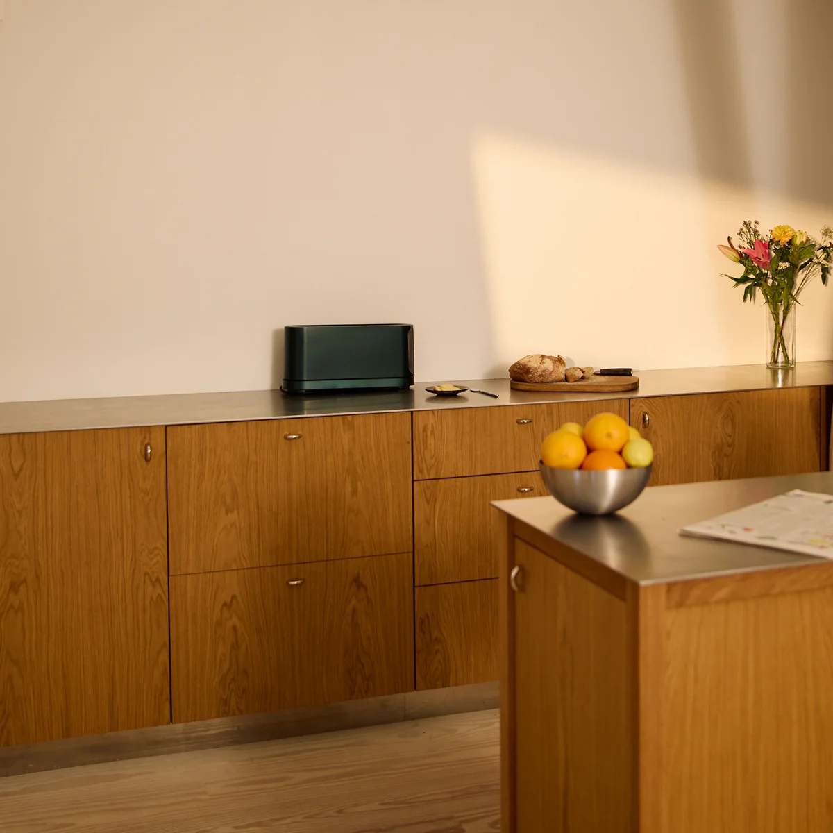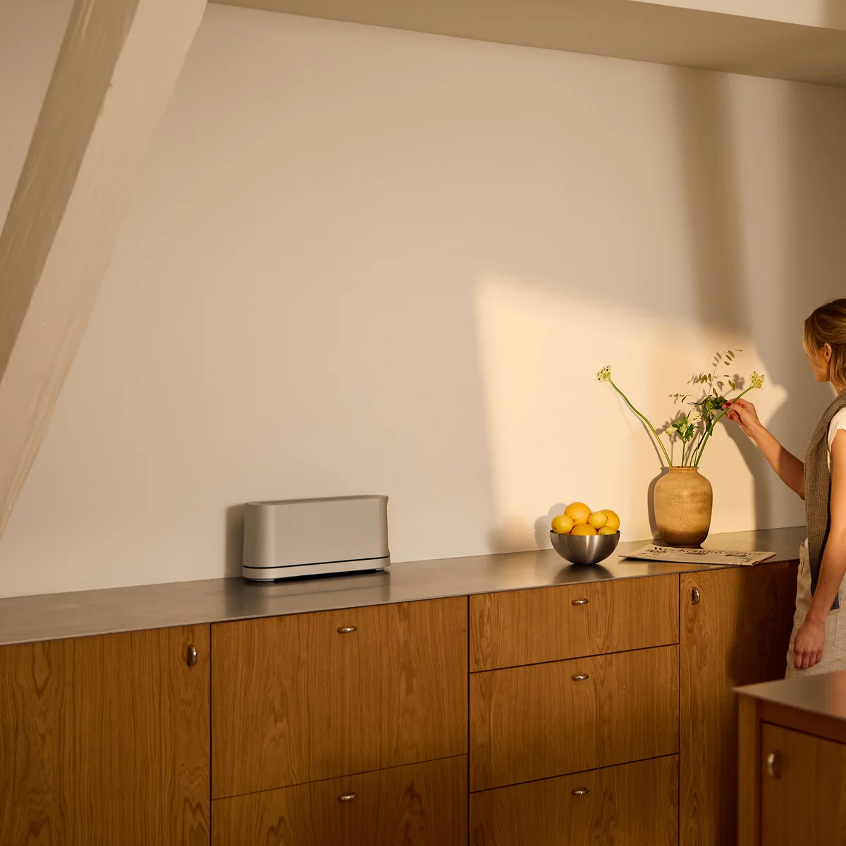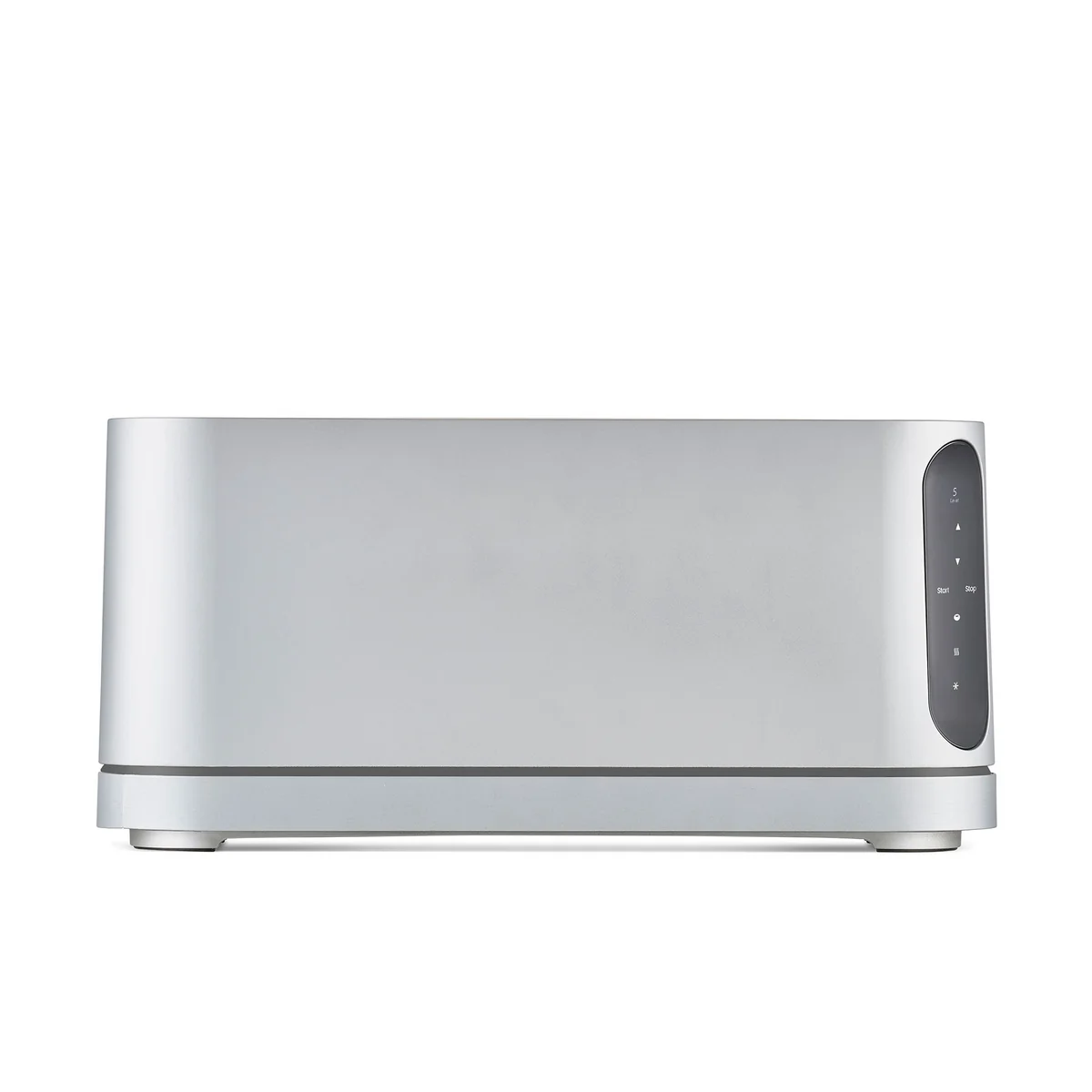 Der Langschlitz-Toaster überzeugt mit hochwertiger Materialauswahl und einem zurückhaltend-eleganten Design. Die Benutzeroberfläche wird bei Annäherung aktiviert und blendet sich automatisch aus, wenn sie nicht gebraucht wird – funktional und formschön aus jedem Blickwinkel.