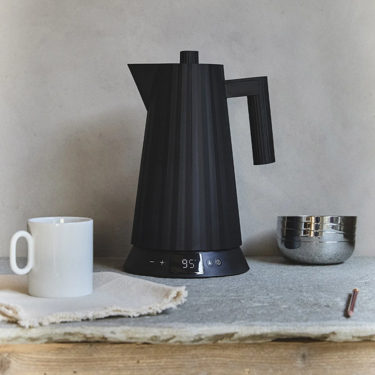 Der elektrische Wasserkocher Plissé von Alessi vereint skulpturales Design mit praktischer Technik. Entworfen von Michele De Lucchi und gefertigt aus hochwertigem thermoplastischem Harz, beeindruckt er durch seine elegante, von plissierten Stoffen inspirierte Form. Die integrierte Temperaturregelung ermöglicht eine präzise Steuerung für verschiedene Getränke – von grünem Tee bis Kaffee.