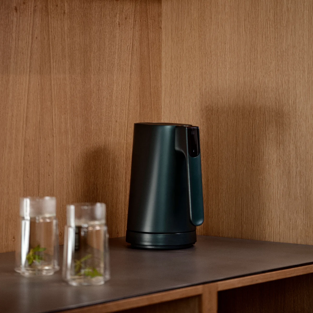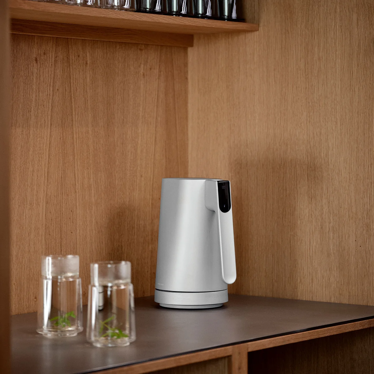 Mit dem neuen elektrischen Wasserkocher von Jacob Jensen wird das tägliche Wasserkochen zum eleganten Erlebnis. Hochwertige Materialien treffen auf durchdachtes Design – das intuitive Touch-Display erwacht bei Annäherung und blendet sich im Ruhemodus dezent aus.