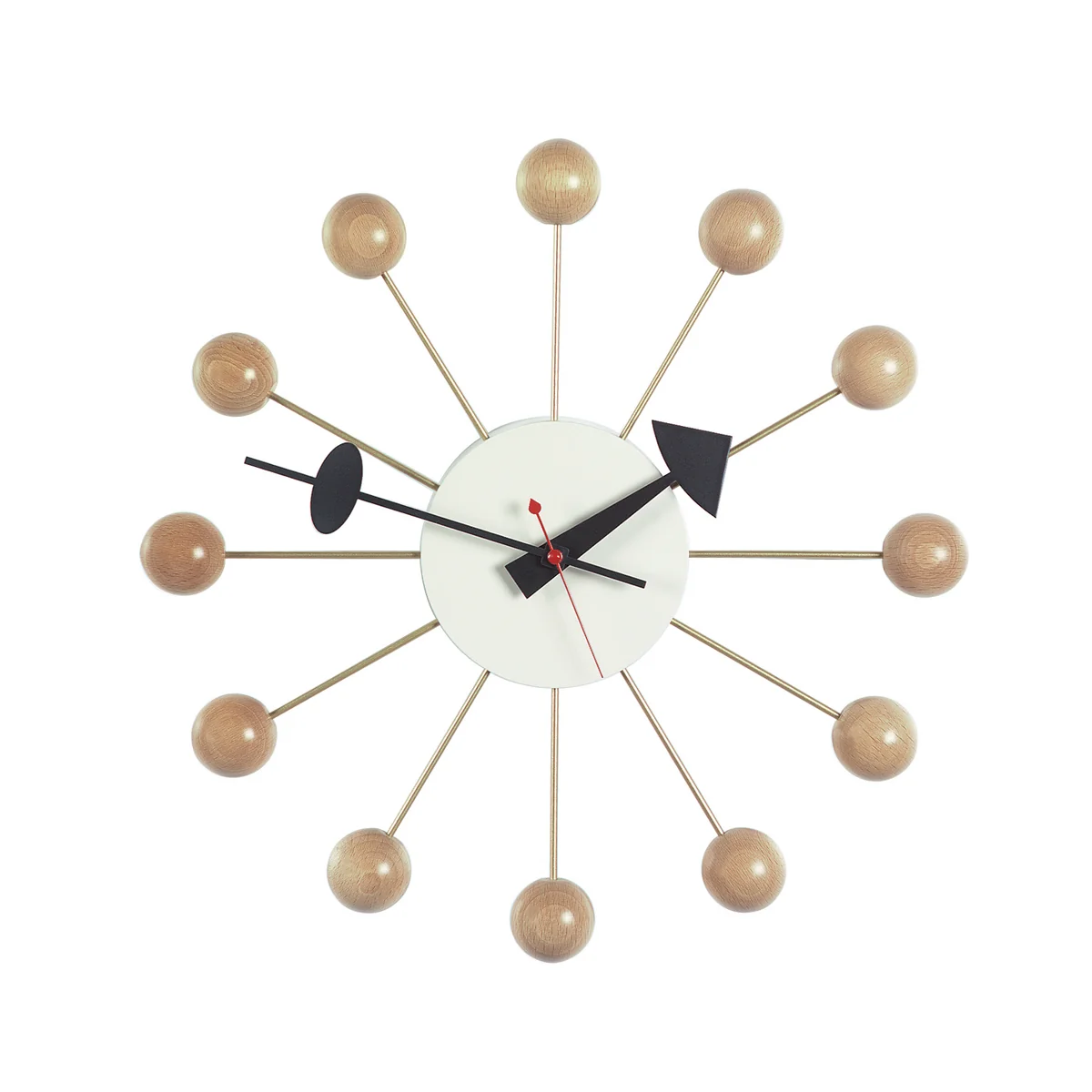 Die Wanduhr ist eine originalgetreue Reedition des 1949 für Howard Miller Clock Company entworfenen Zeitmessers. Sie besticht durch eine hochwertige Materialverarbeitung und skulpturale Form. Die markanten Stundenmarkierungen und farblich abgesetzten Zeiger gewährleisten eine gute Lesbarkeit.