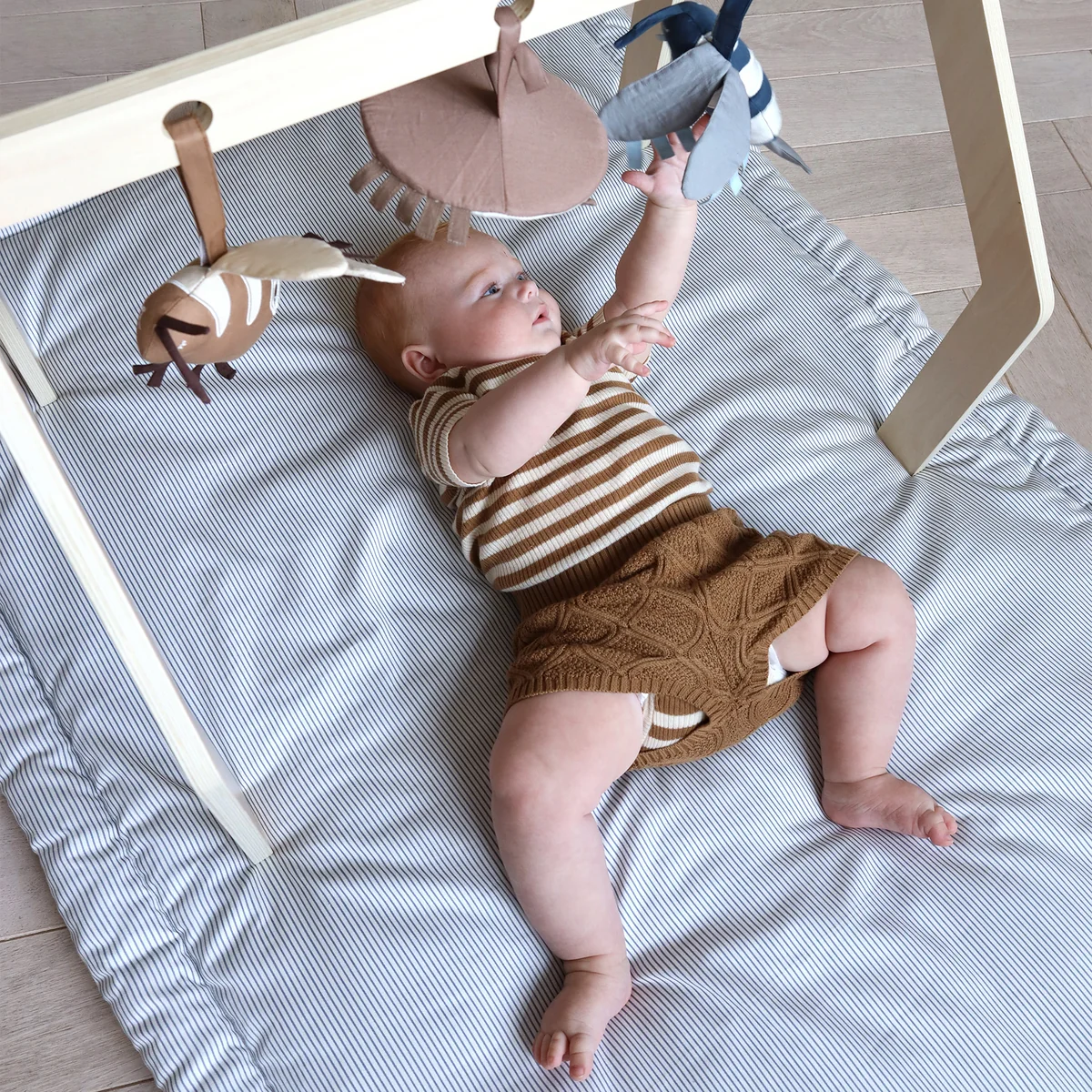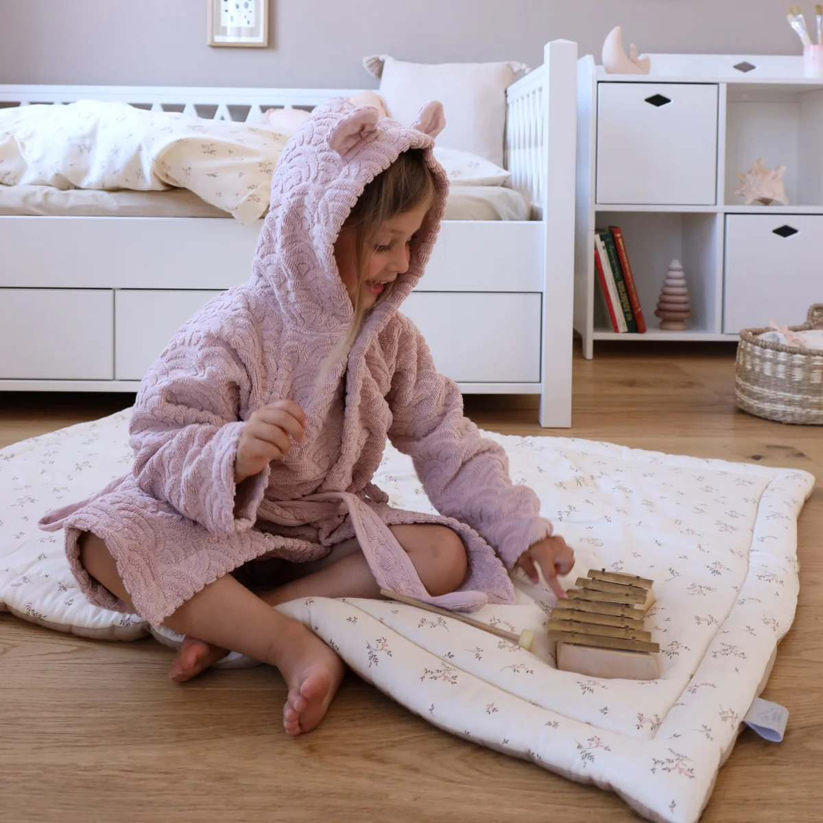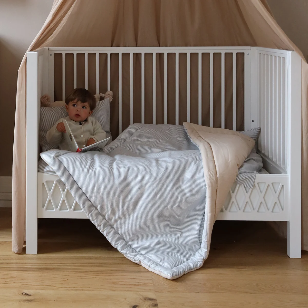 Die Decke aus dem dänischen Hause Cam Cam Copenhagen ist der ideale Partner zum gemütlichen Einkuscheln. Die Steppdecke wird aus OCS-zertifizierter Bio-Baumwolle gefertigt und eignet sich hervorragend, um Babys zuhause oder gar unterwegs einzuwickeln. Sie ist in einer Vielzahl von klassischen Cam Cam Mustern erhältlich. Die Vorderseite ist mit dem jeweiligen Print bedruckt, während die Rückseite passend einfarbig gefärbt ist. Die Steppdecke wird mit Öko-Tex-zertifiziertem Polyester befüllt. Bei Bedarf kann sie bei 30 Grad in der Waschmaschine gereinigt werden. Nicht trocken schleudern, mildes Waschmittel verwenden.