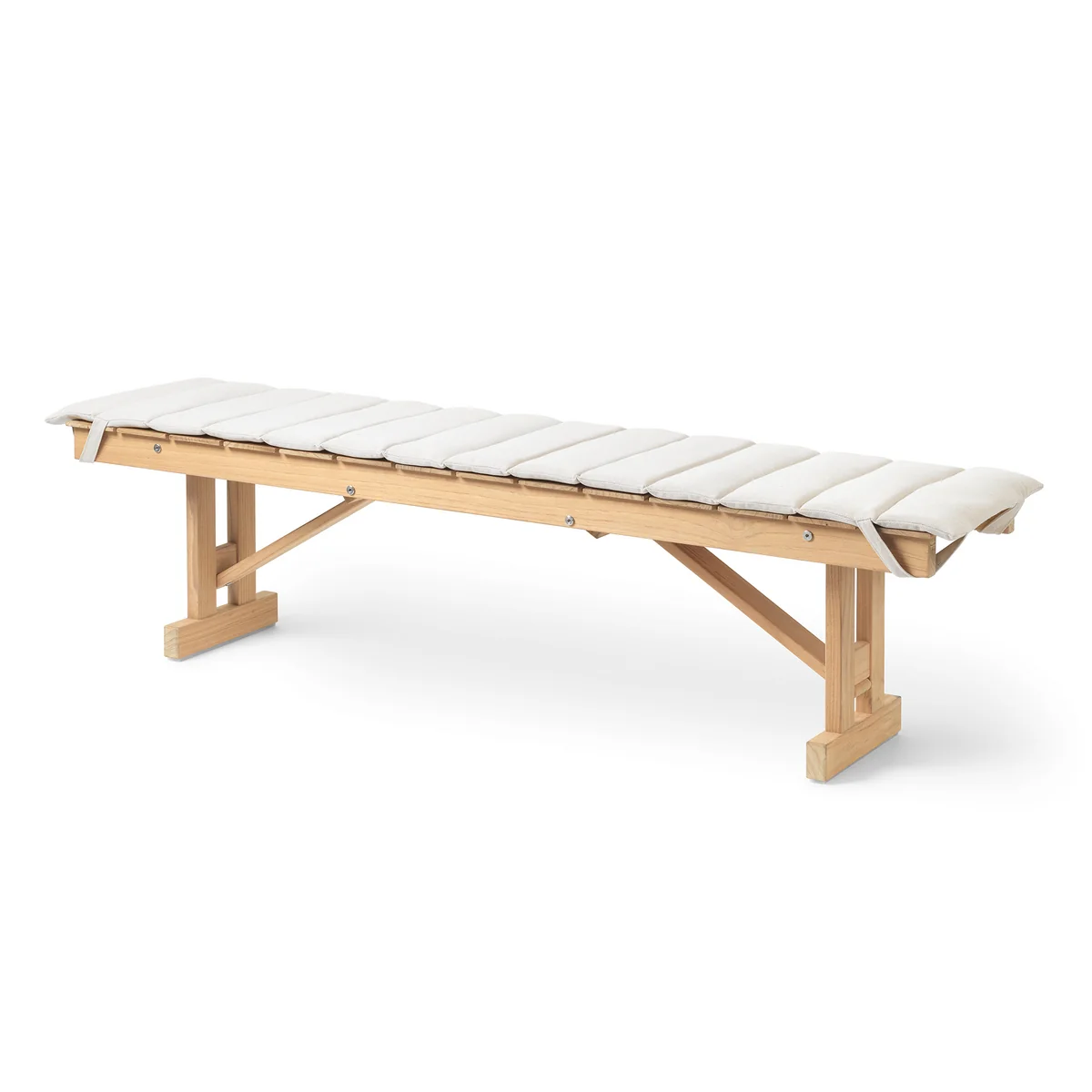 Die Sitzauflage für die BM1871 Bank von Børge Mogensen für Carl Hansen macht die Bank für den Außenbereich noch komfortabler. Die Auflage wird mittels Gummibändern an der Bank befestigt und trotzt so auch einer stärkeren Windböe.