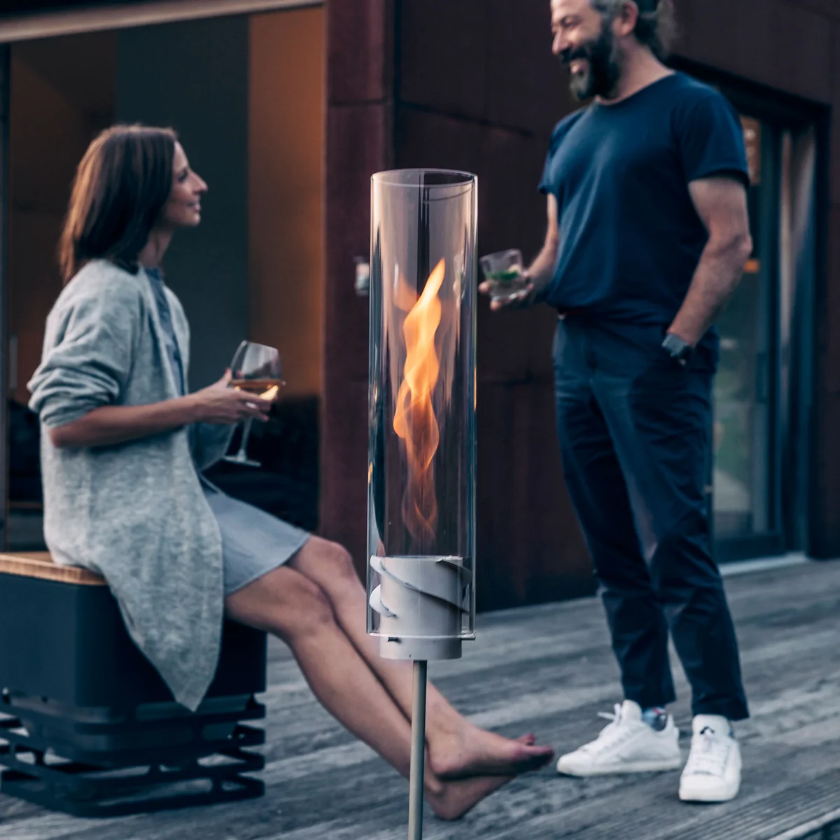 Mit dem Fuß lässt sich die Spin Fackel in ein Tischfeuer verwandeln. Einfach Spiel gegen den Fuß austauschen und schon entsteht ein gemütliches Feuer auf dem Gartentisch.