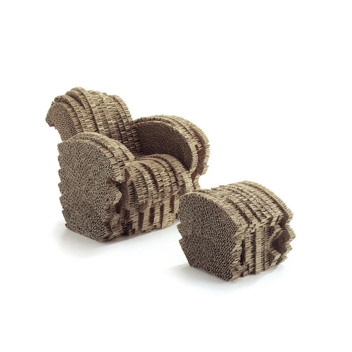 Kartonmöbel als preiswerte und leichte Alternative zu traditionellen Möbeln tauchen schon während der 60er Jahre auf. Die meisten Entwürfe zielten darauf ab, dem Karton die nötige Tragfähigkeit durch Steck- und Faltverbindungen zu verleihen. Gehry wählte ein anderes Verfahren, das massive Kartonmöbel, gleichsam Kartonskulpturen, entstehen ließ: »Ich schaute eines Tages in meinem Büro auf einen Stapel Wellpappe – das Material aus dem ich Architekturmodelle zu bauen pflegte – und ich begann damit zu spielen, es zusammenzukleben und es mit einer Handsäge und einem Taschenmesser in Form zu schneiden«.