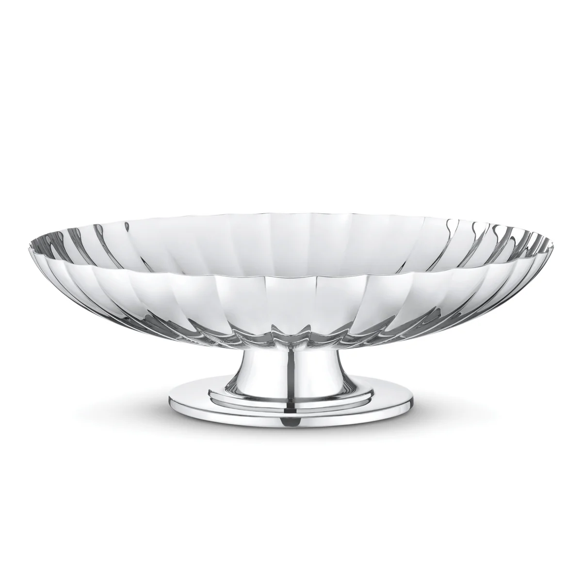 Die hochwertige Schale aus Edelstahl hat den Fuß eines Original Leuchters von Bernadotte für Georg Jensen. Die elegant gewölbte Oberfläche sorgt für das einzigartige Design der Bernadotte Serie. Als Einzelstück oder für den Esstisch geeignet.