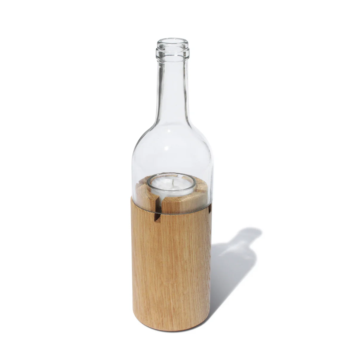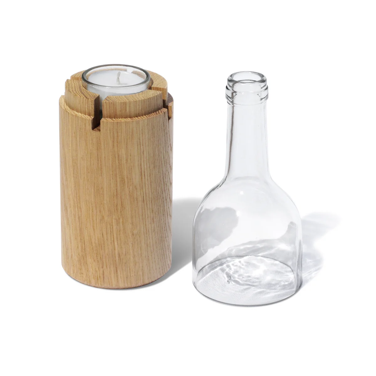 Ja, oben besteht das WeinLicht von side by side tatsächlich aus einer echten Weinflasche. Das untere Stück aus massivem, geöltem Holz ist ebenfalls einer Flaschenunterseite nachempfunden und zusammen ergibt das ein stimmungsvolles Windlicht.