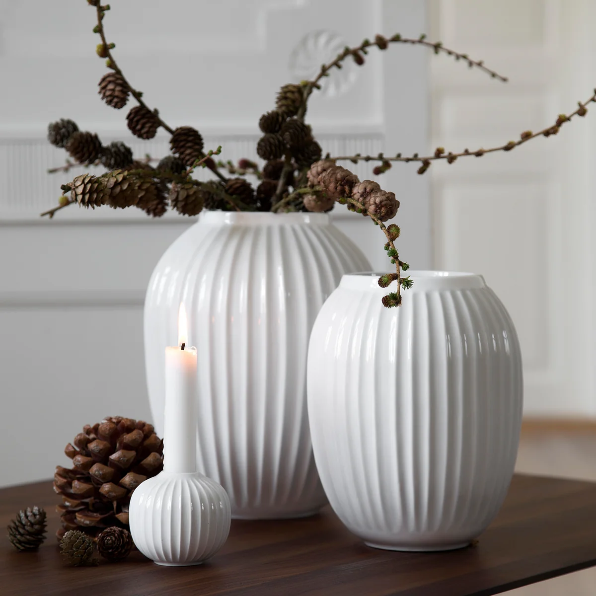 Die beeindruckenden Vasen von Kähler Design mit dem charakteristischen Rillenmuster gehören zu der Hammershøi Serie, die von Hans-Christian Bauer entworfen wurde. Für die Vasen und die gesamte Serie ließ sich Bauer von den voluminösen Vasen von Svend Hammershøi inspirieren, die er bereits um 1900 in der Werkstatt von Kähler schuf.