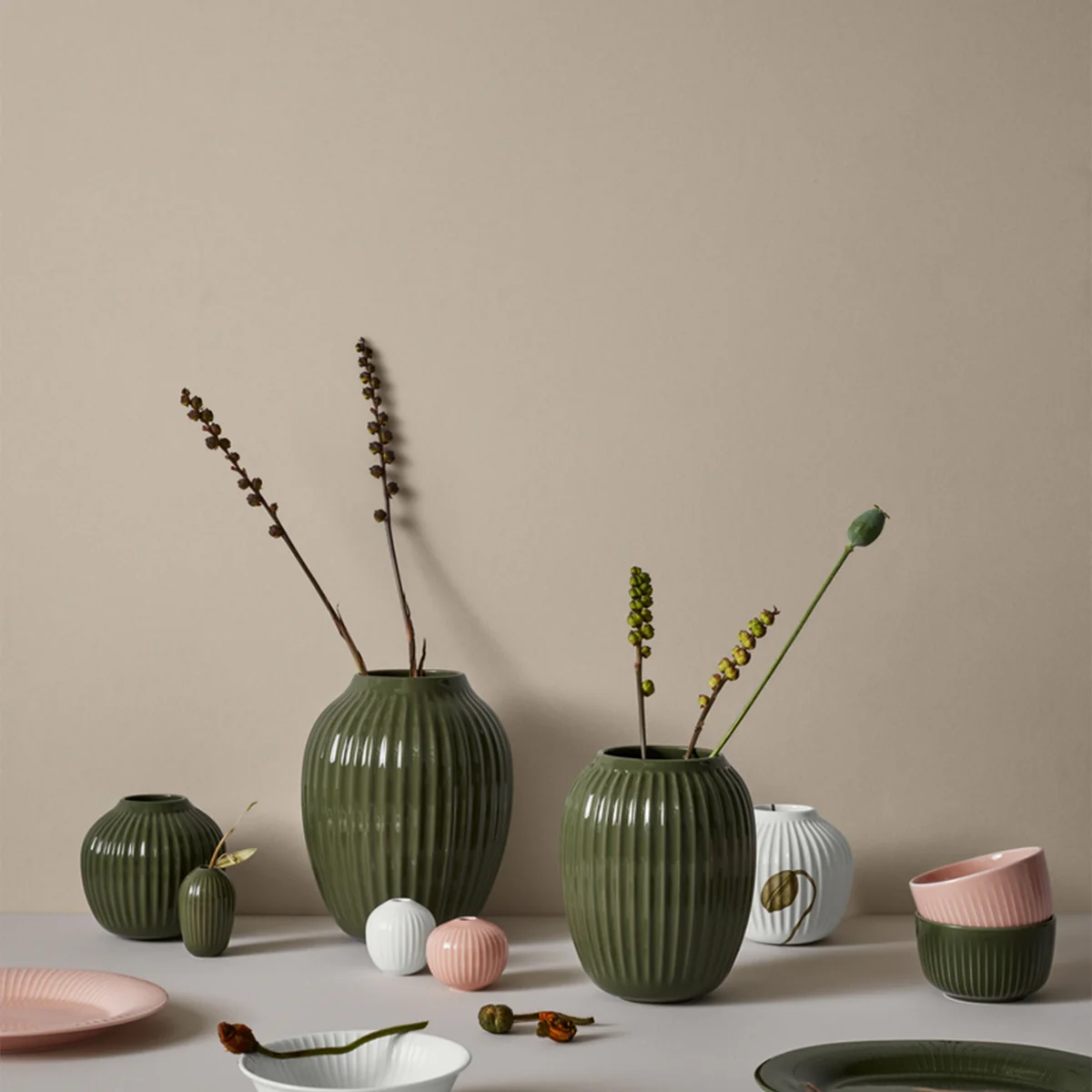 Die Hammershøi Vasen werden aus Porzellan hergestellt und sind in verschiedenen Farben und Größen erhältlich. Sowohl allein als auch in einer Gruppe von mehreren werden die außergewöhnlichen Vasen, die an antike Amphoren erinnern, zum Hingucker in jedem Raum.