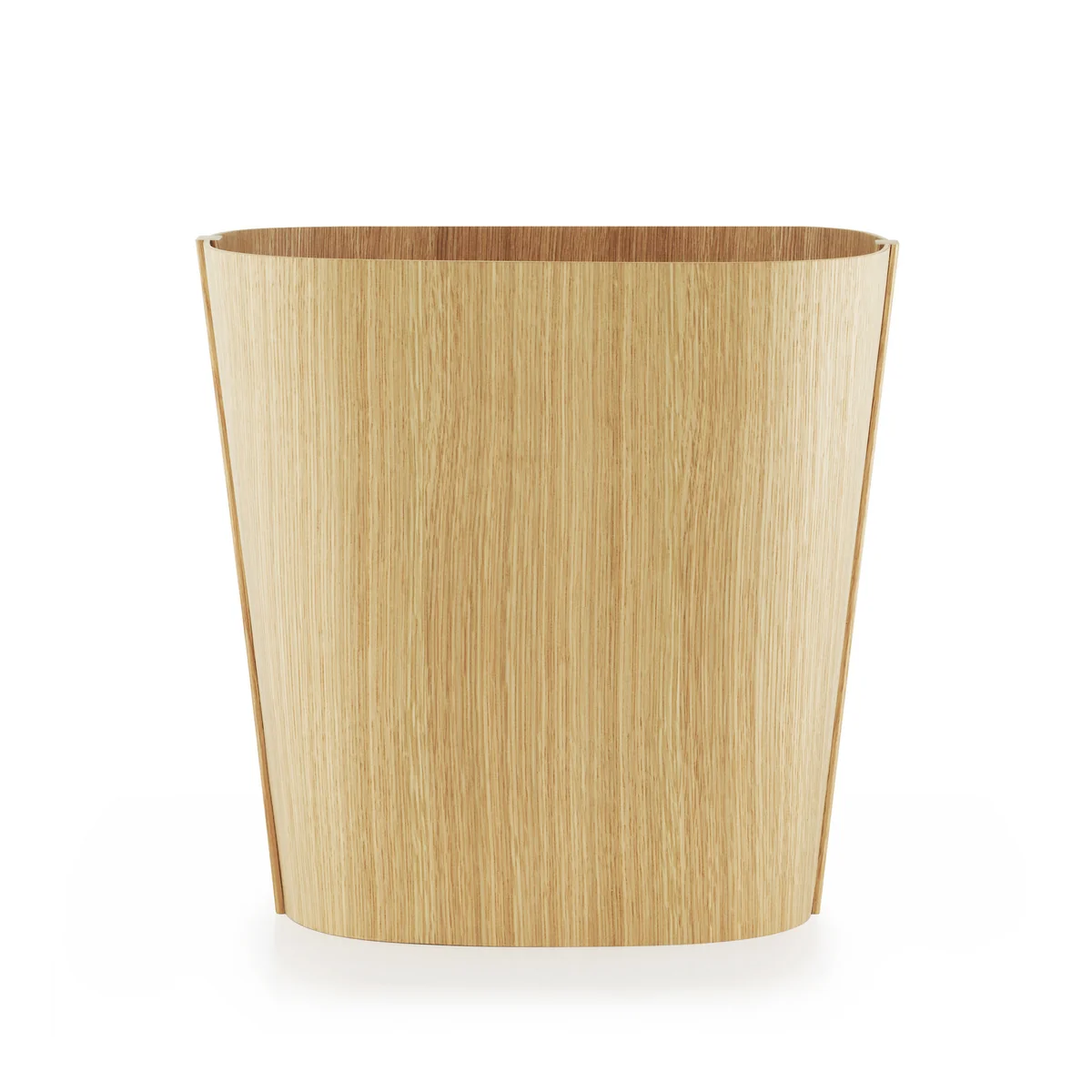 Der Papierkorb wird aus hochwertigem Holzfurnier gefertigt, das unter Druck und Hitze in seine charakteristisch abgerundete Form gepresst wird. Ein raffinierter Kantenabschluss steht im Kontrast zu der organisch, gebogenen Form und erweckt den Eindruck einer leichten aber stabilen Konstruktion.