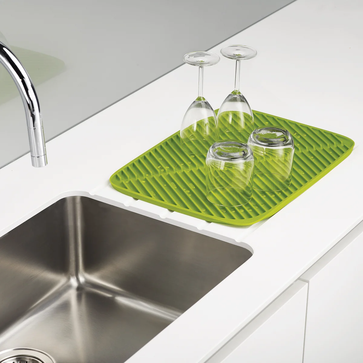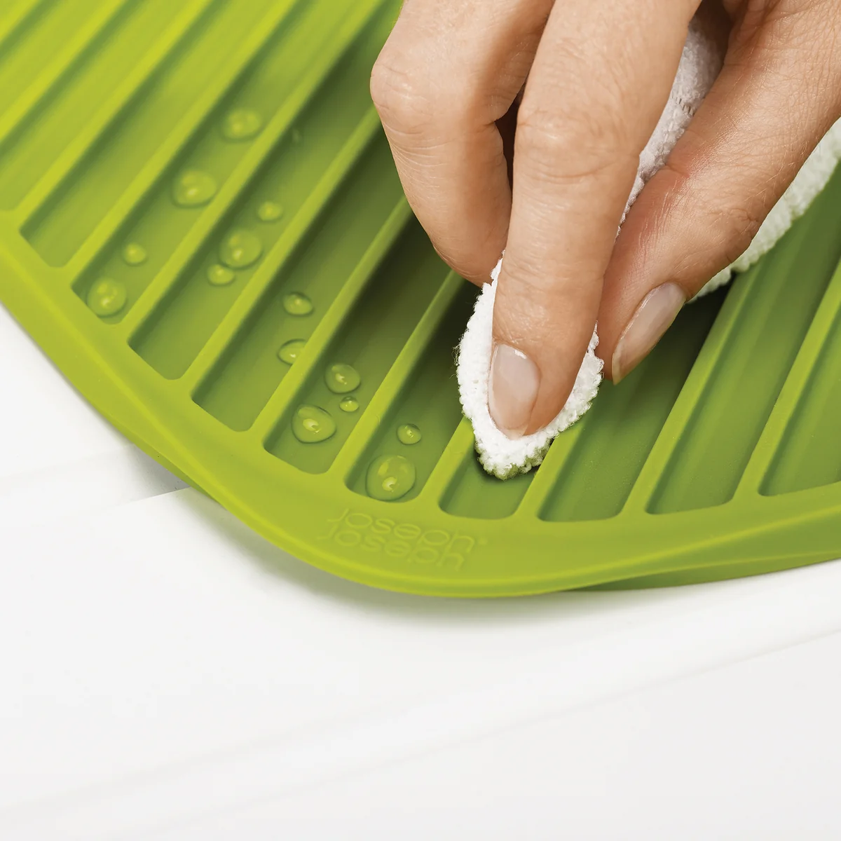 Dank der Fertigung aus weichem Gummi ist die Joseph Joseph Abtropfmatte auch für empfindliches Geschirr bestens geeignet. Nach dem Gebrauch kann die Flume Abtropfmatte einfach gereinigt werden und verschwindet anschließend wieder platzsparend im Schrank.