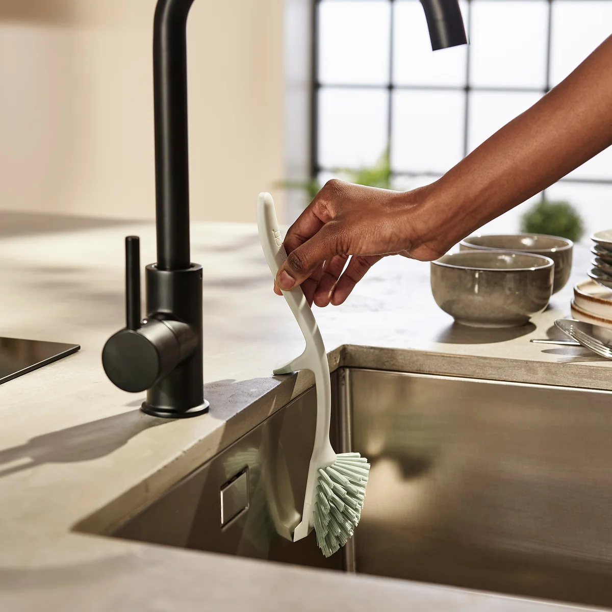 Die Edge Spülbürste von Joseph Joseph hilft dabei, den Platz in, auf und neben der Spüle optimal auszunutzen - indem sie einfach eingehängt wird.
